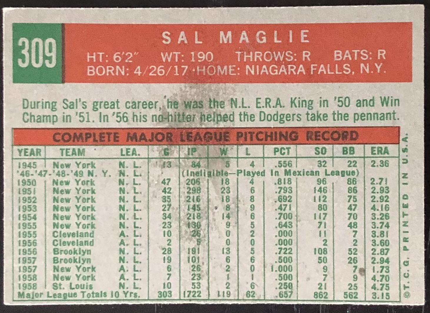 Lot 1231 1959 TOPPS GRAY BACK SAL MAGLIE