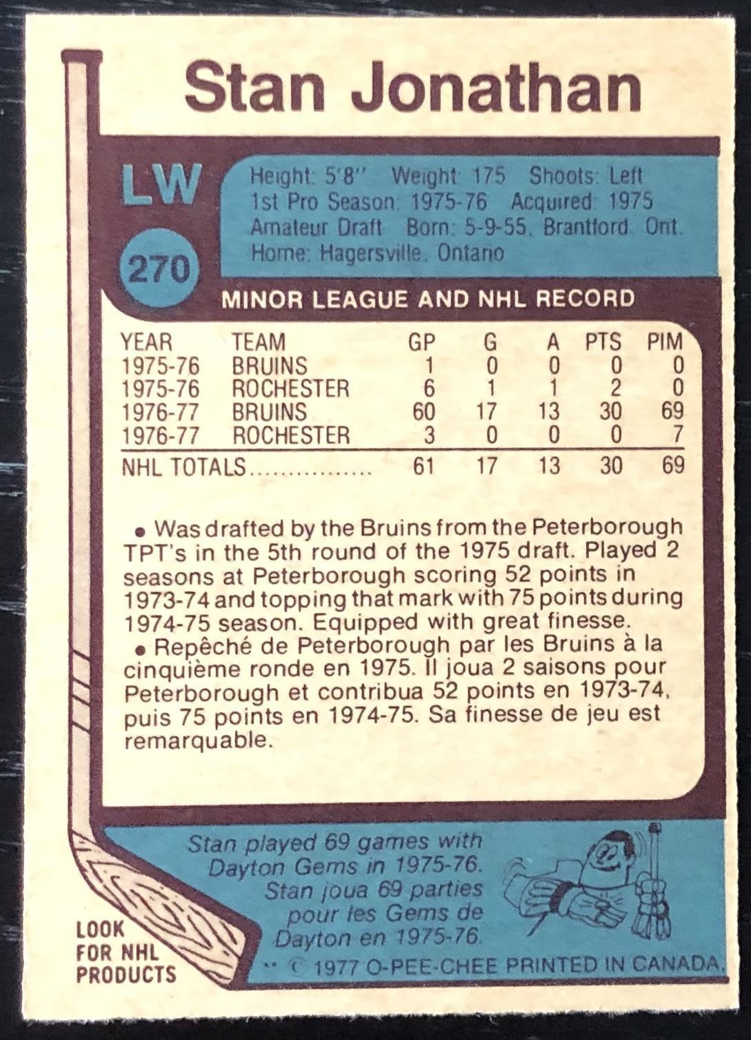 Lot 1294 1977-78 O-PEE-CHEE STAN JONATHAN ROOKIE CARD