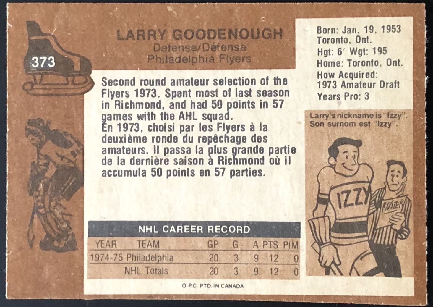 Lot 1322 1975-76 O-PEE-CHEE LARRY GOODENOUGH ROOKIE CARD