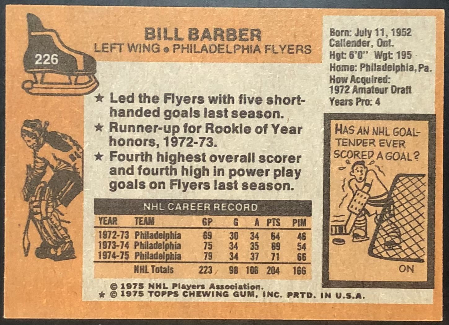 Lot 1335 1975-76 NHL TOPPS BILL BARBER (HOF)