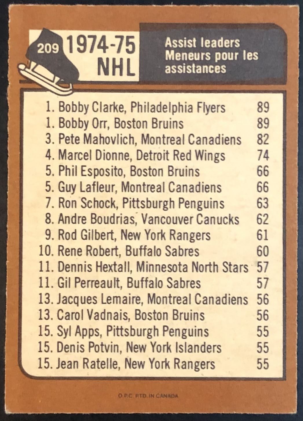 Card #209 NHL, hockey, vintage, OPC, hall of fame
