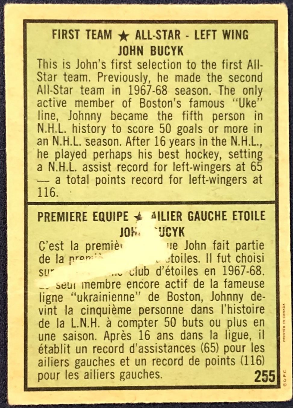 Card #255 paper loss on back vintage, hall of fame, hockey, NHL, OPC
