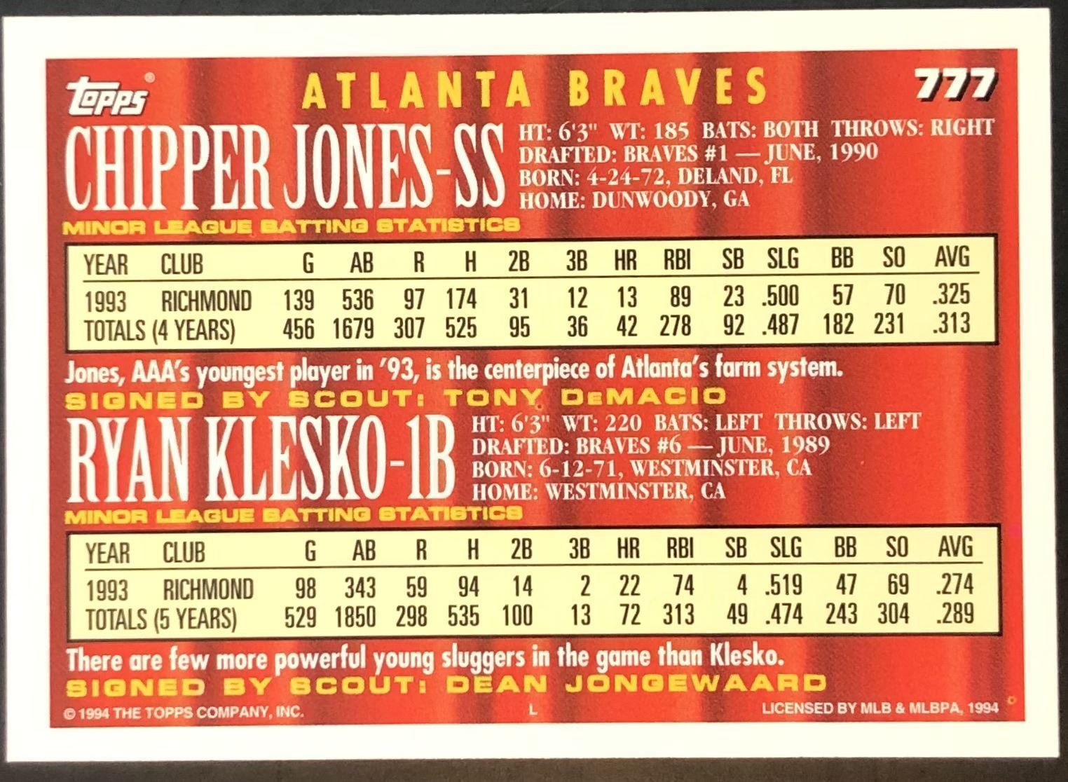 Lot 1442 1994 TOPPS CHIPPER JONES (HOF) ROOKIE CARD