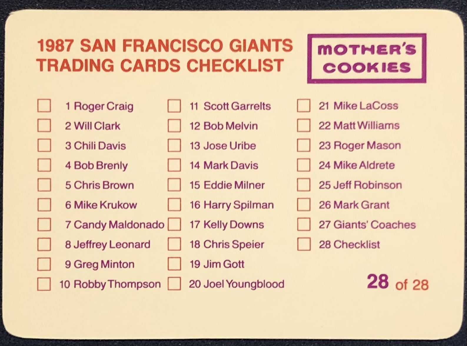 Lot 1449 1987 MOTHER'S COOKIES SAN FRANCISCO GIANTS SET