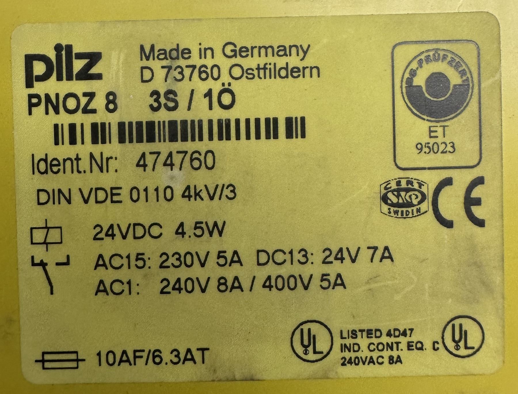 Pilz #474760 / PNOZ8 3S/10 Safety Relay