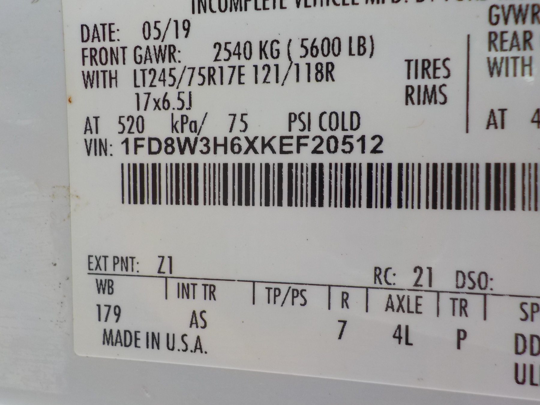 Vehicle ID Number: 1FD8W3H6XKEF20512