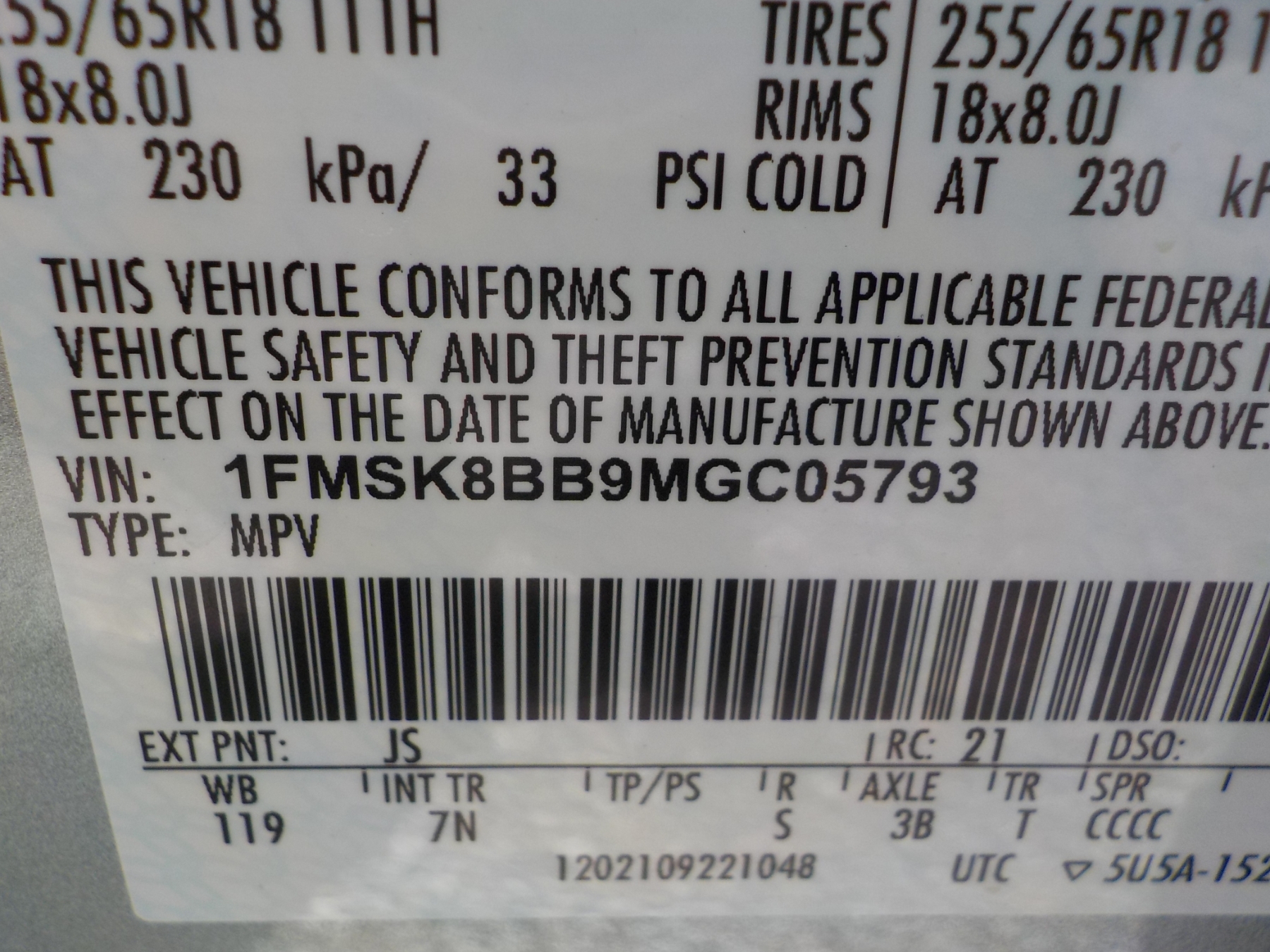 Vehicle ID Number: 1FMSK8BB9MGC05793