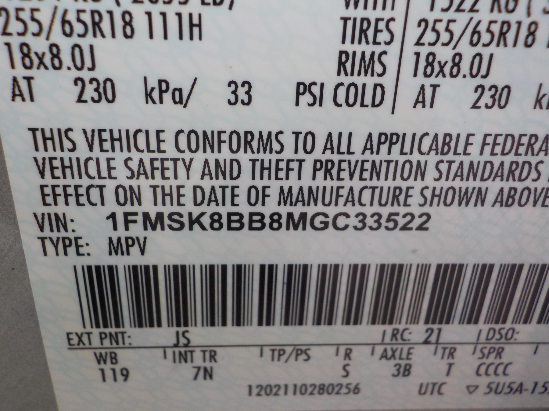 Vehicle ID Number: 1FMSK8BB8MGC33522