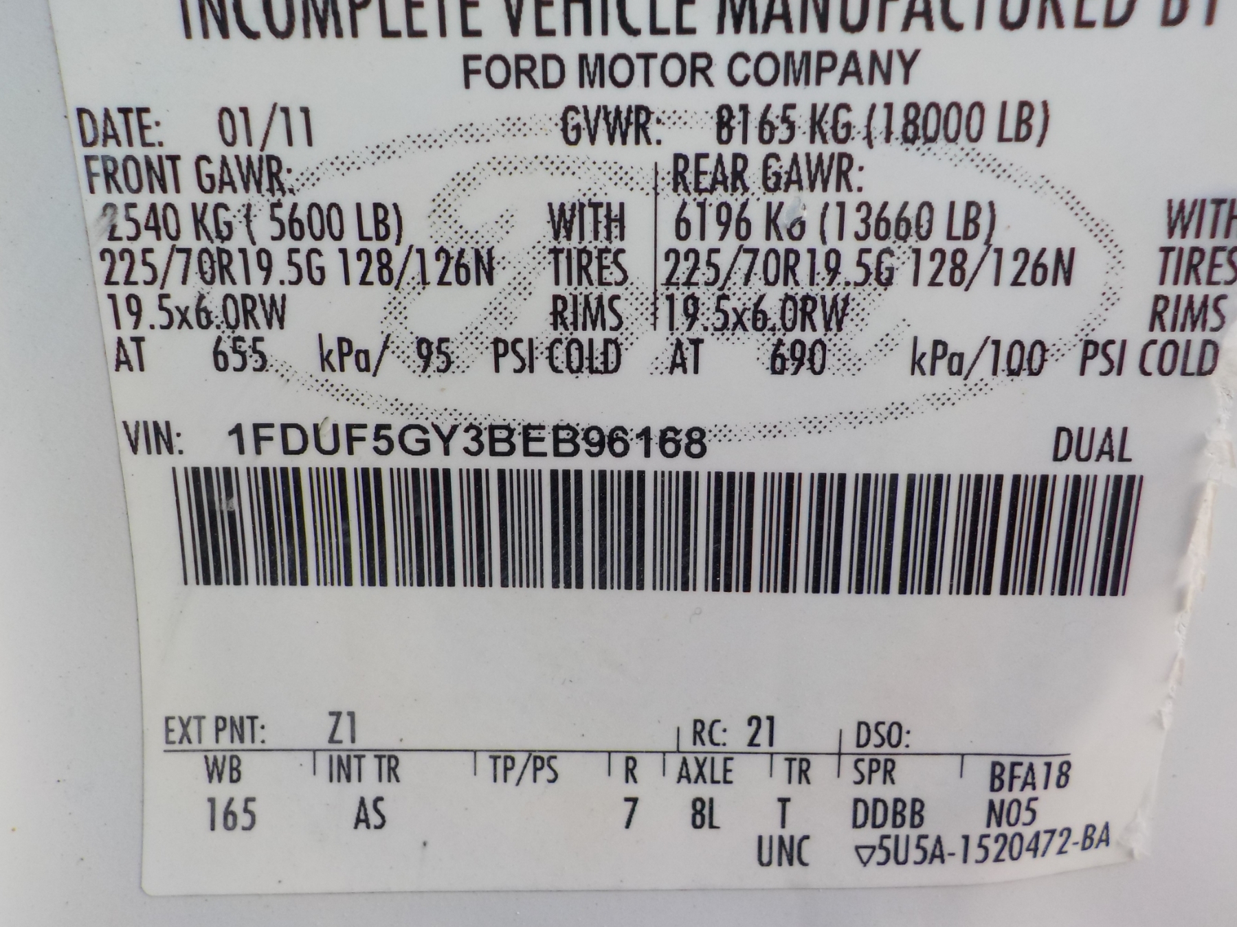 Vehicle ID Number: 1FDUF5GY3BEB96168