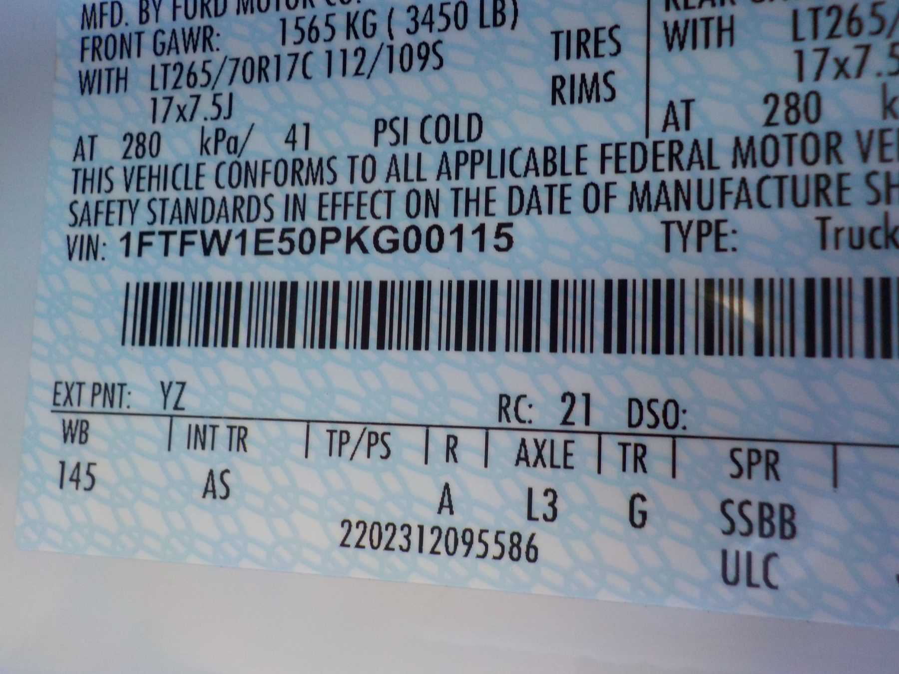 Vehicle ID Number: 1FTFW1E50PKG00115