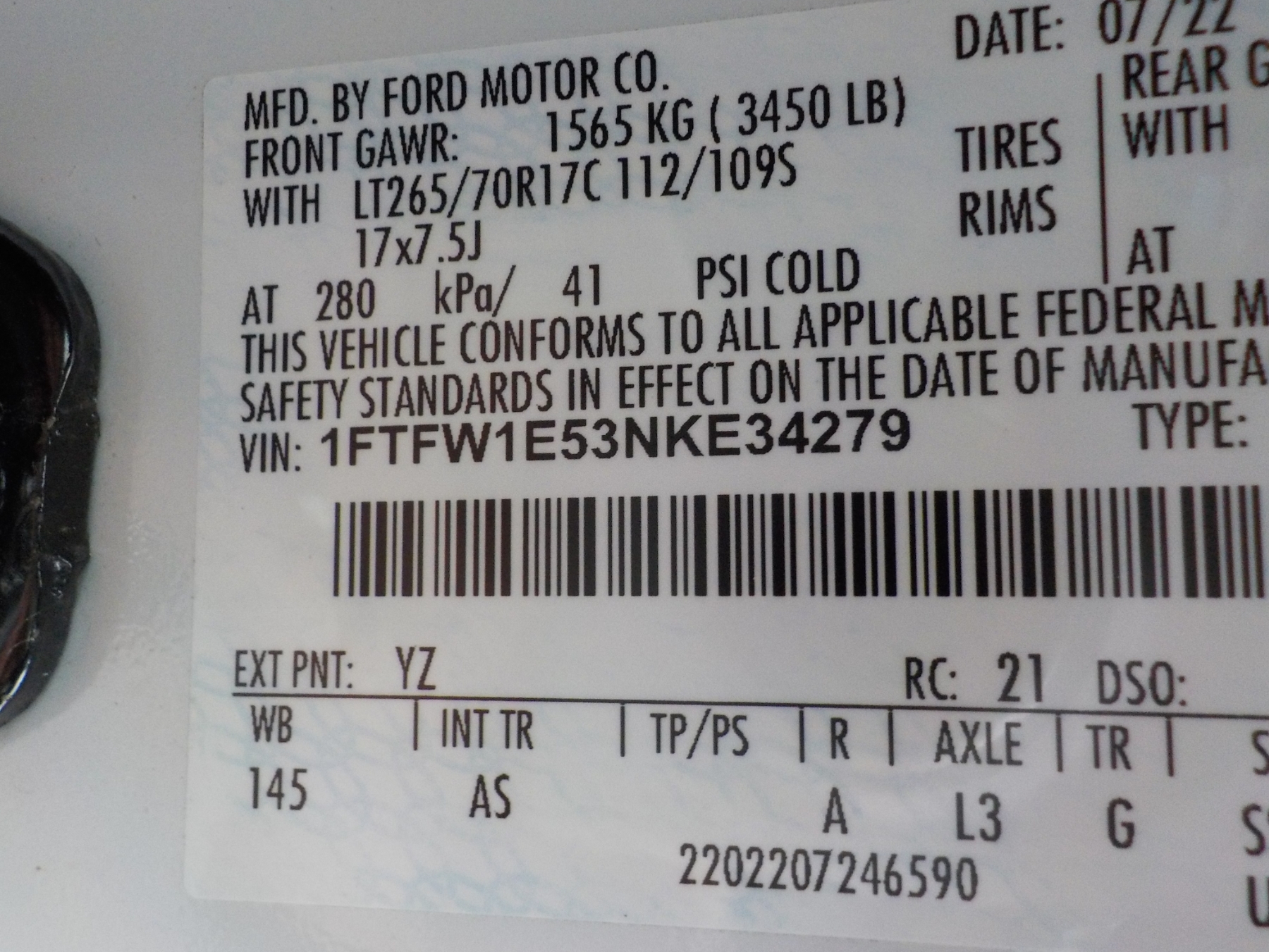 Vehicle ID Number: 1FTFW1E53NKE34279