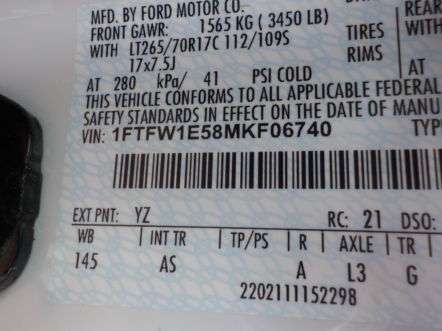 Vehicle ID Number: 1FTFW1E58MKF06740