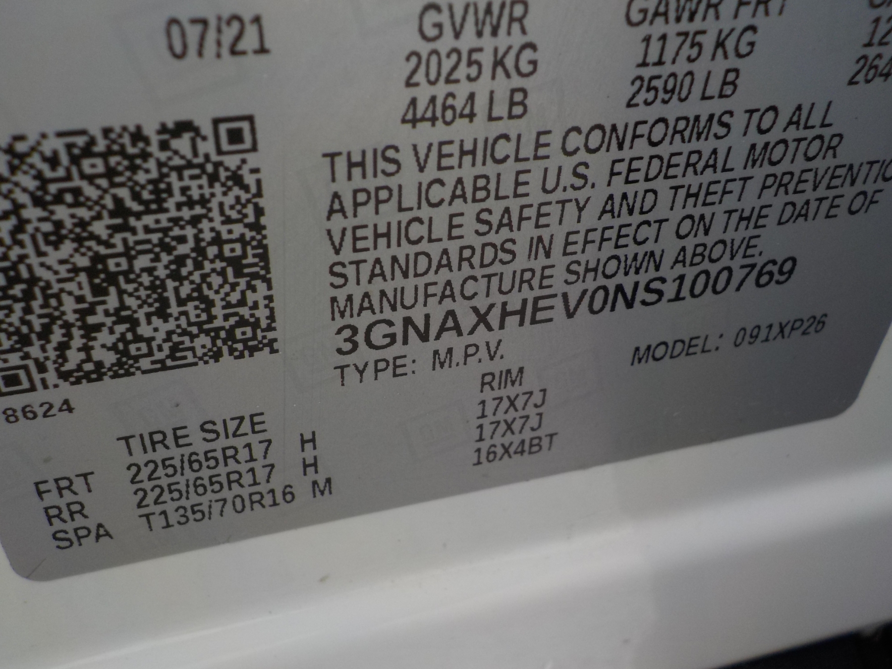 Vehicle ID Number: 3GNAXHEV0NS100769