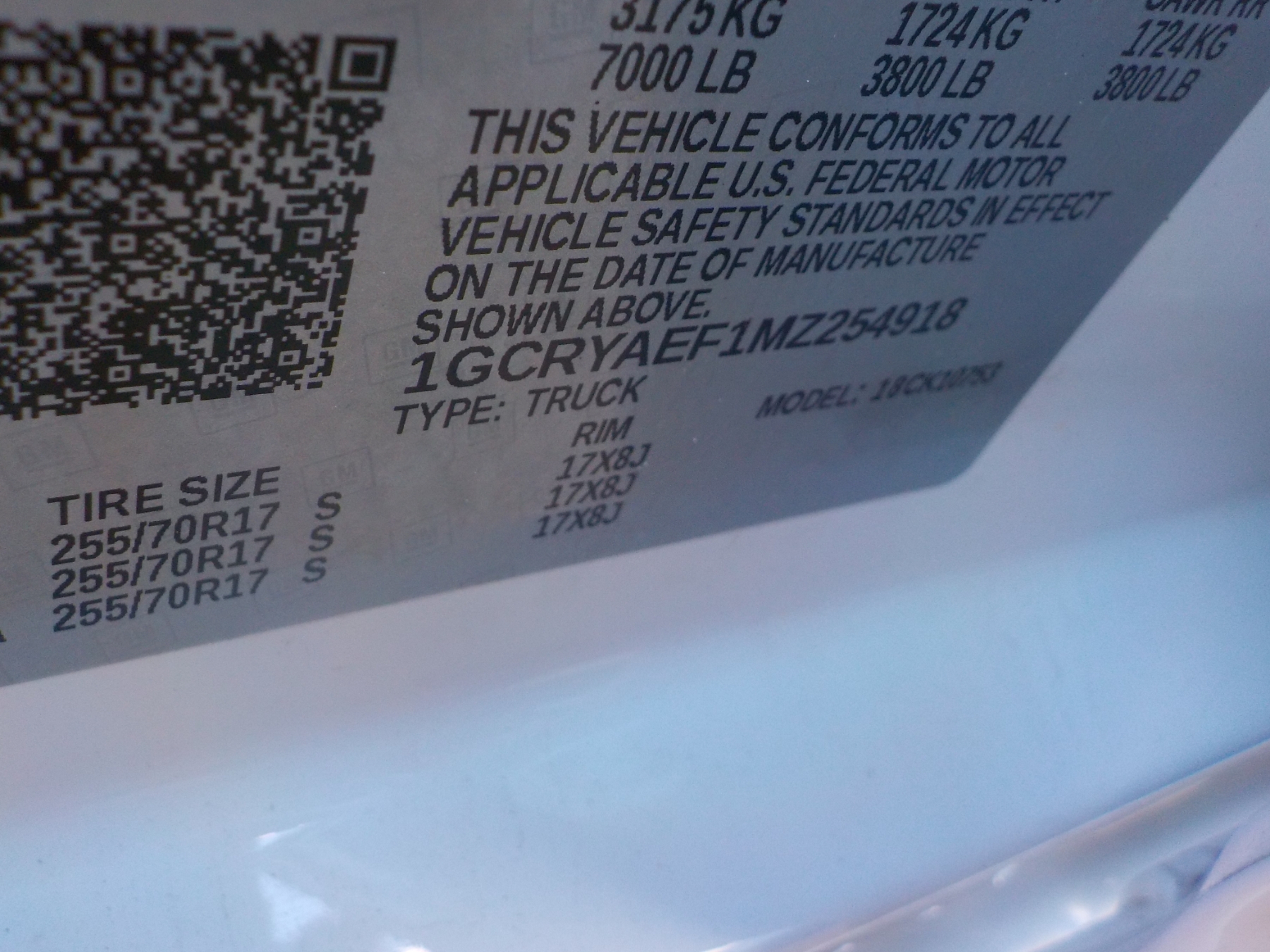 Vehicle ID Number: 1GCRYAEF1MZ254918