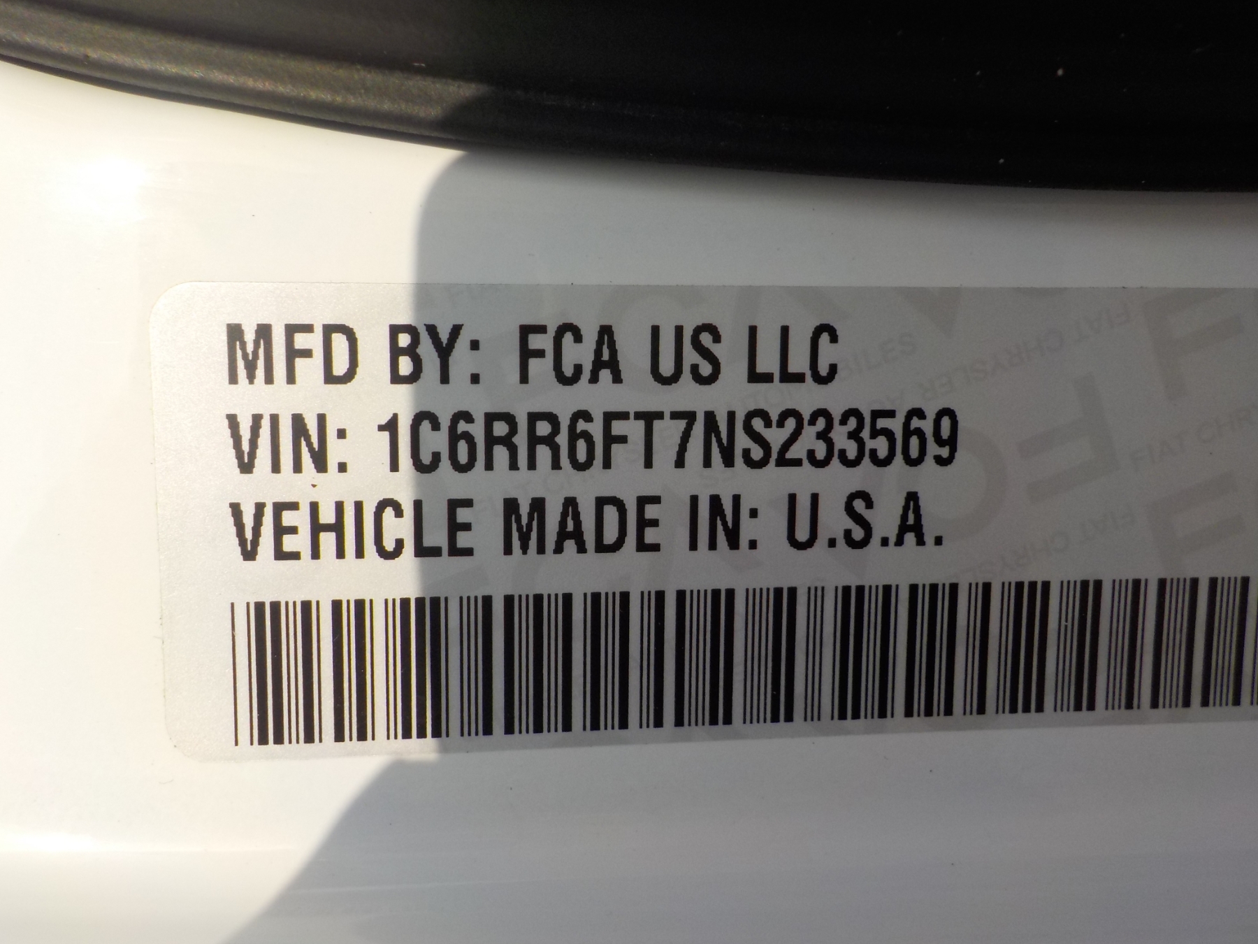 Vehicle ID Number: 1C6RR6FT7NS233569