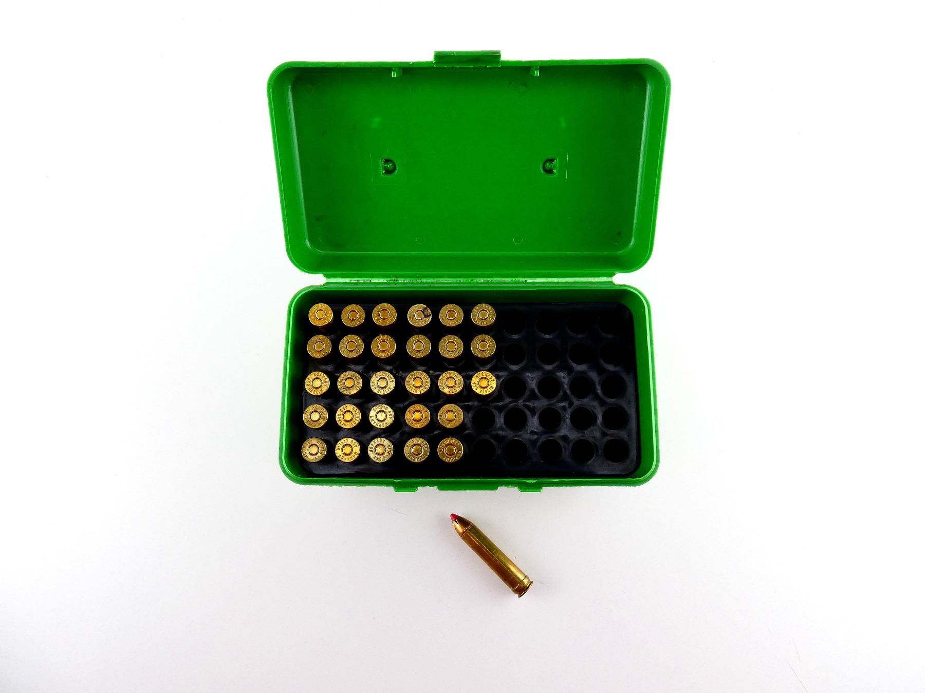LOT INCLUDES; APPROX. (29) RNDS, CONSIGNOR STATES; "HORNADY 350 GRNS LEVER EVOLUTION", (1) MTM CASE-GARD 50 PLASTIC AMMO BOX.