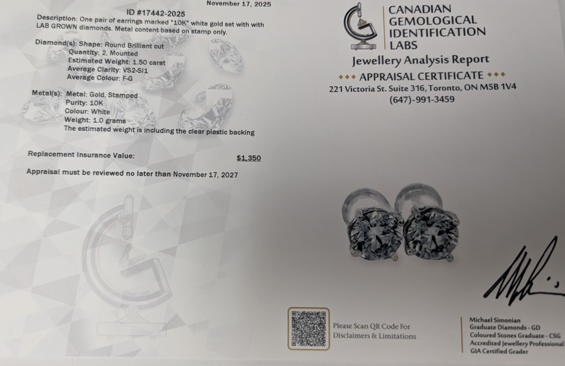 10K(1G), LAB DIAMOND (1.5CT) EARRING, APPRAISED INSURANCE VALUE $1350