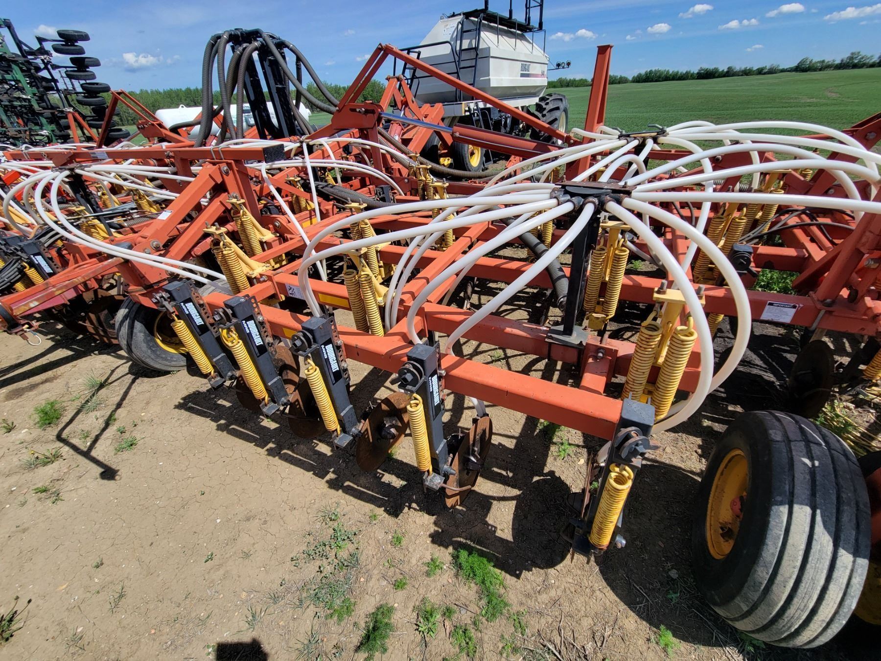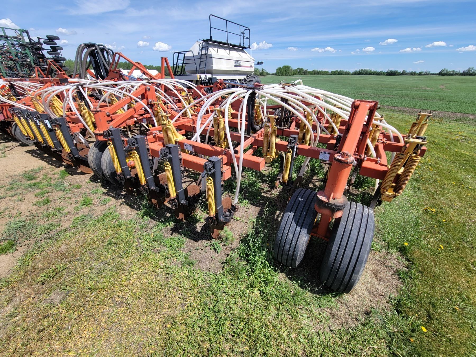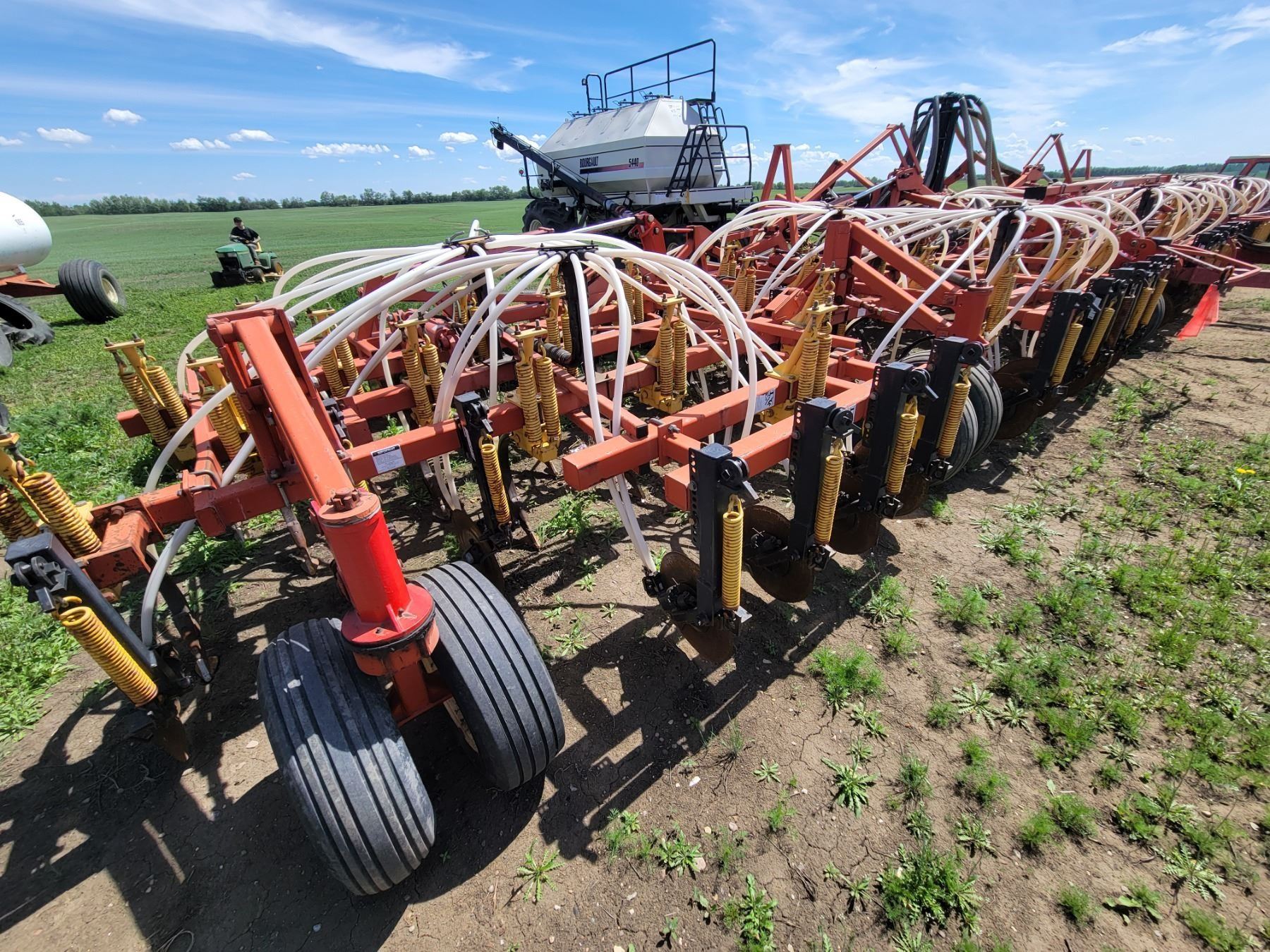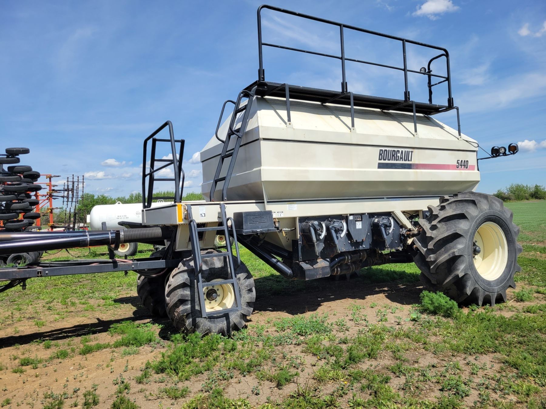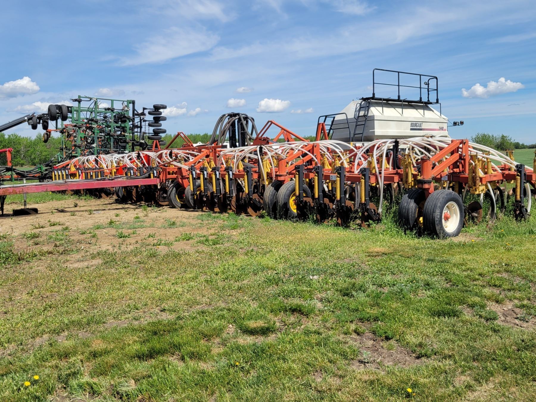 62' Bourgault 5710 Air Drill, serial 37182AH-02, approx. 10" spacing, mid row banders, double shoot, solid packers c/w 5440 3- comp. Tank. New Drive Clutch. This was purchased at the Hruschak Estate Sale, July 8th 2025 & never used since. It had a $31,000 work order in 2023 at Wask. Motors. Ph Neil (780) 512-8300. Located North of Radway