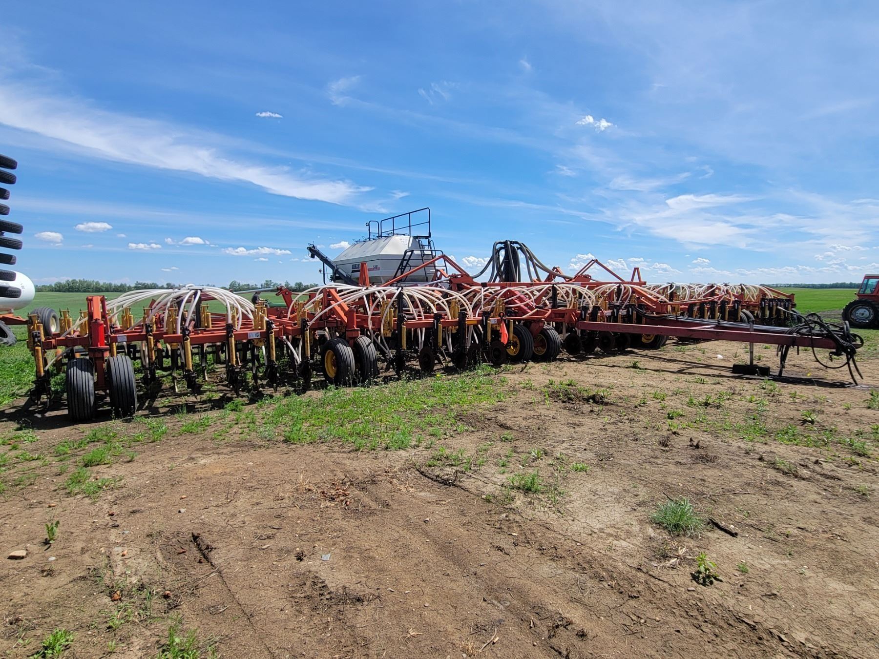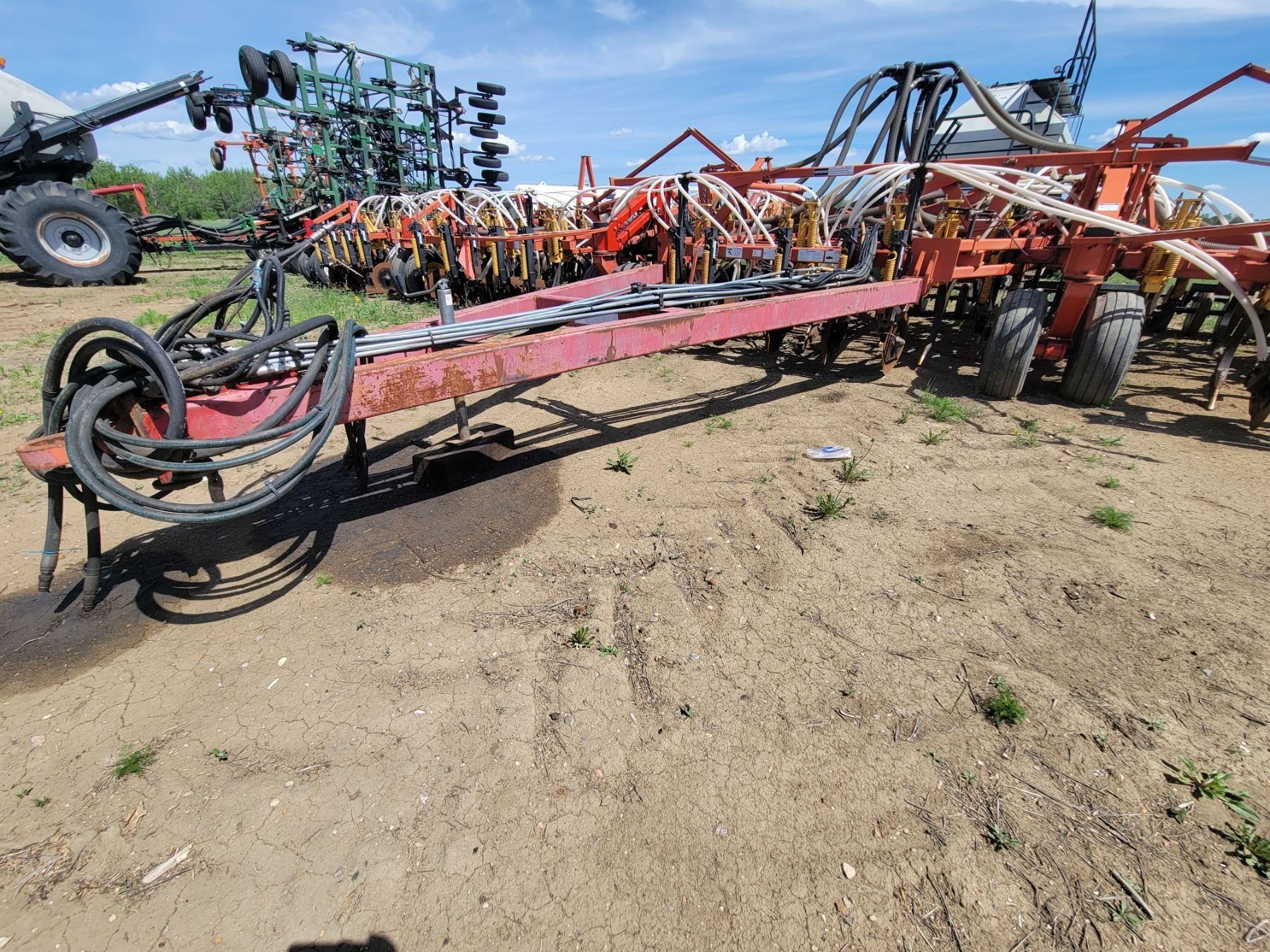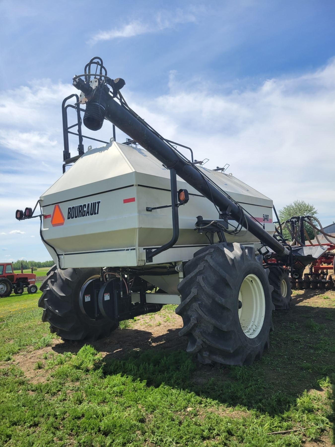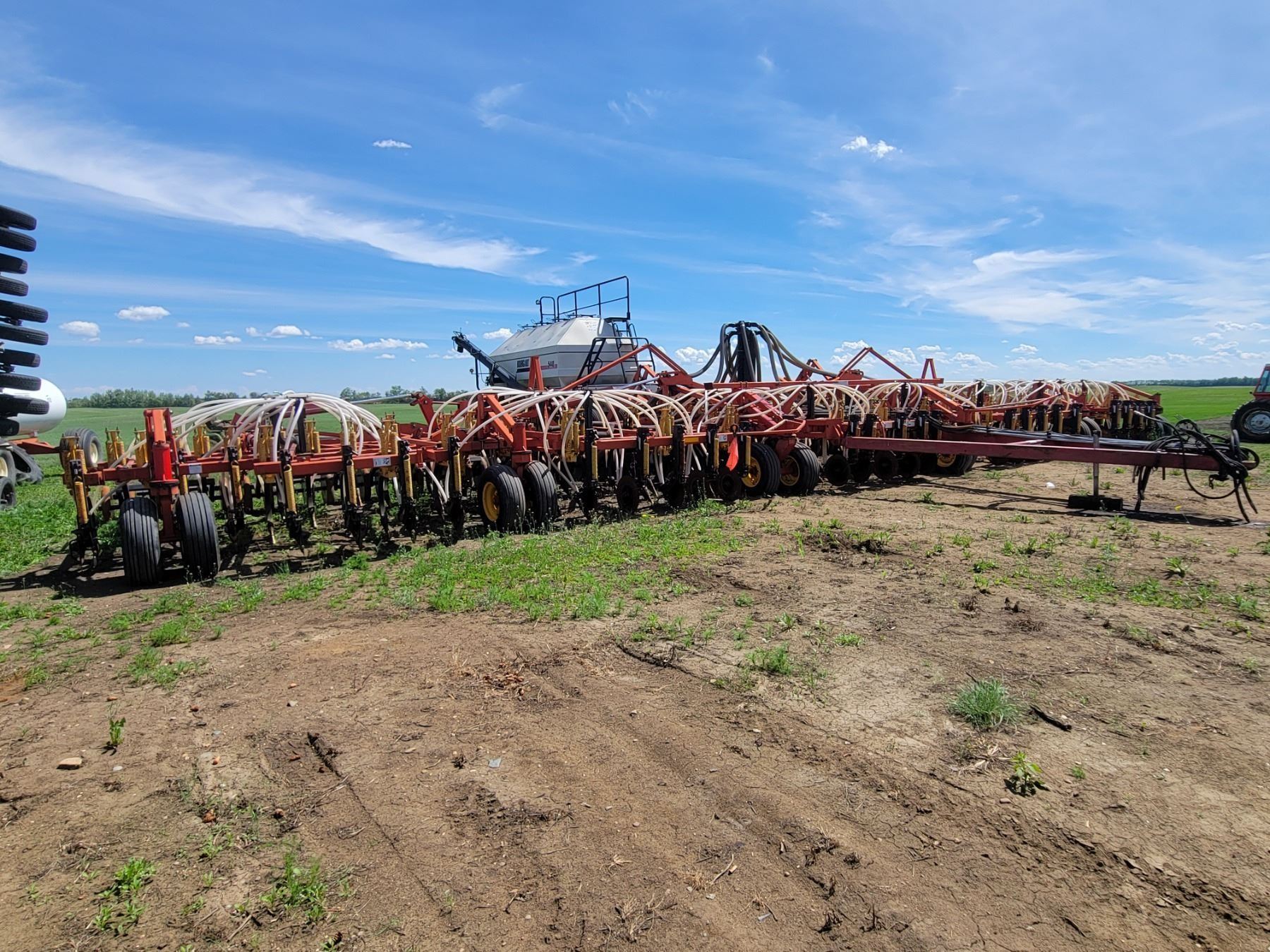 62' Bourgault 5710 Air Drill, serial 37182AH-02, approx. 10" spacing, mid row banders, double shoot, solid packers c/w 5440 3- comp. Tank. New Drive Clutch. This was purchased at the Hruschak Estate Sale, July 8th 2025 & never used since. It had a $31,000 work order in 2023 at Wask. Motors. Ph Neil (780) 512-8300. Located North of Radway