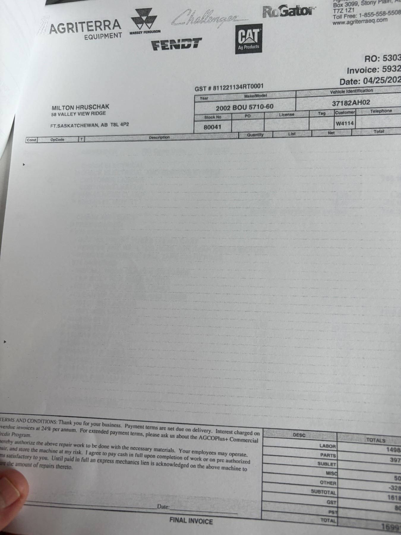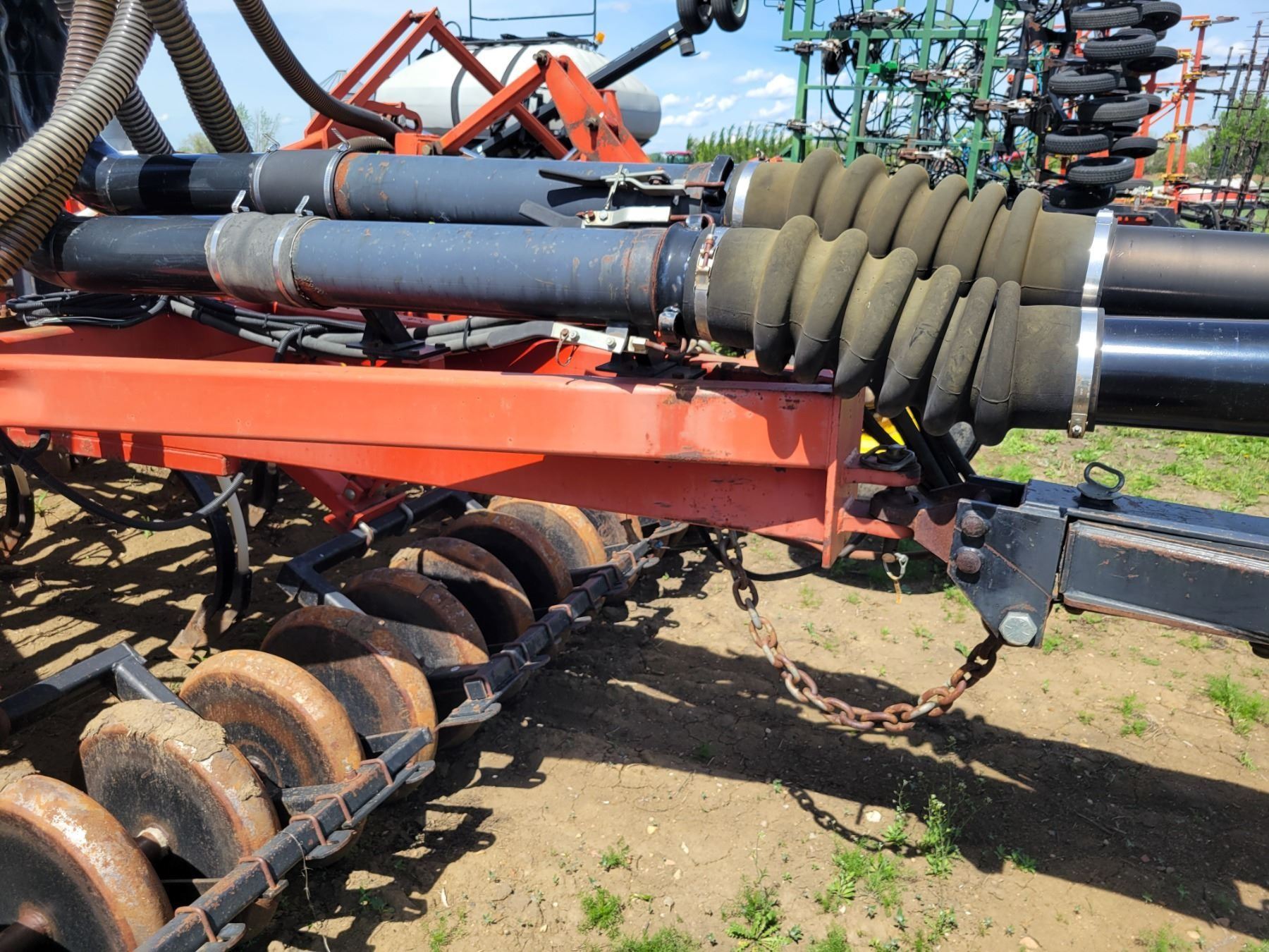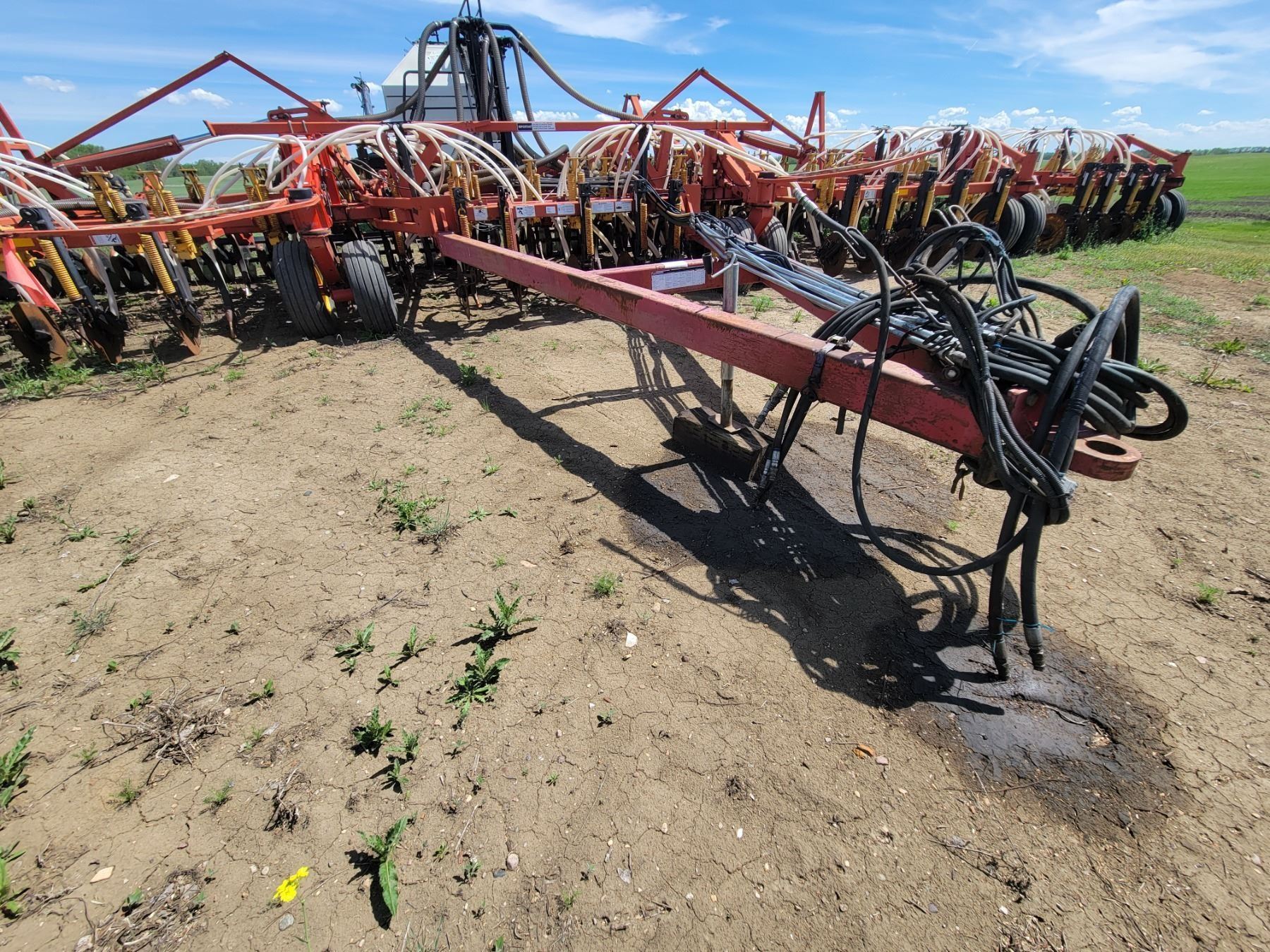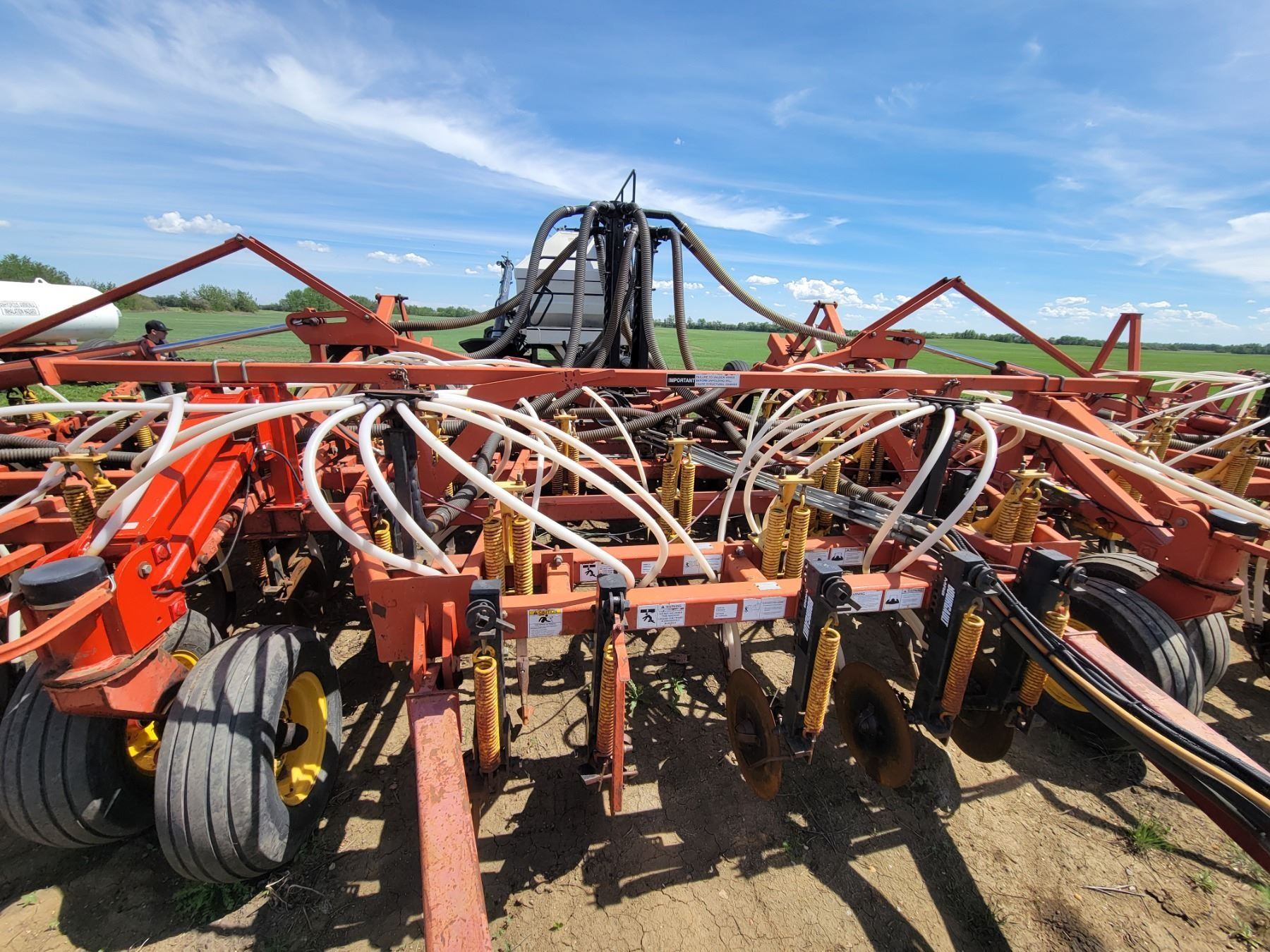 62' Bourgault 5710 Air Drill, serial 37182AH-02, approx. 10" spacing, mid row banders, double shoot, solid packers c/w 5440 3- comp. Tank. New Drive Clutch. This was purchased at the Hruschak Estate Sale, July 8th 2025 & never used since. It had a $31,000 work order in 2023 at Wask. Motors. Ph Neil (780) 512-8300. Located North of Radway