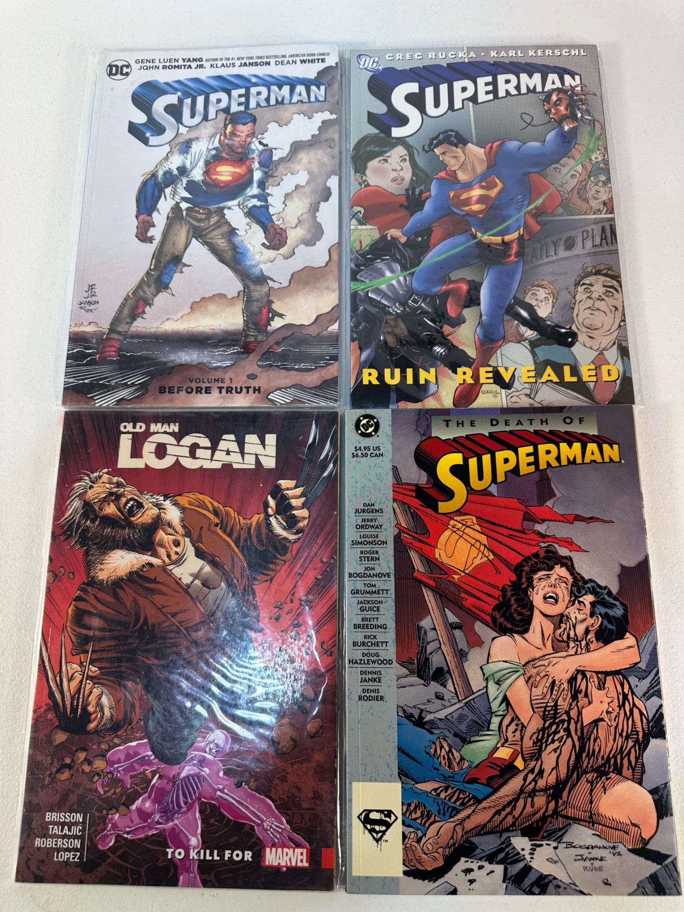 Collection of four graphic novels including Superman Volume 1: Before Truth, Superman: Ruin Revealed, Old Man Logan: To Kill For, and The Death of Superman. Features classic and modern DC and Marvel storylines.