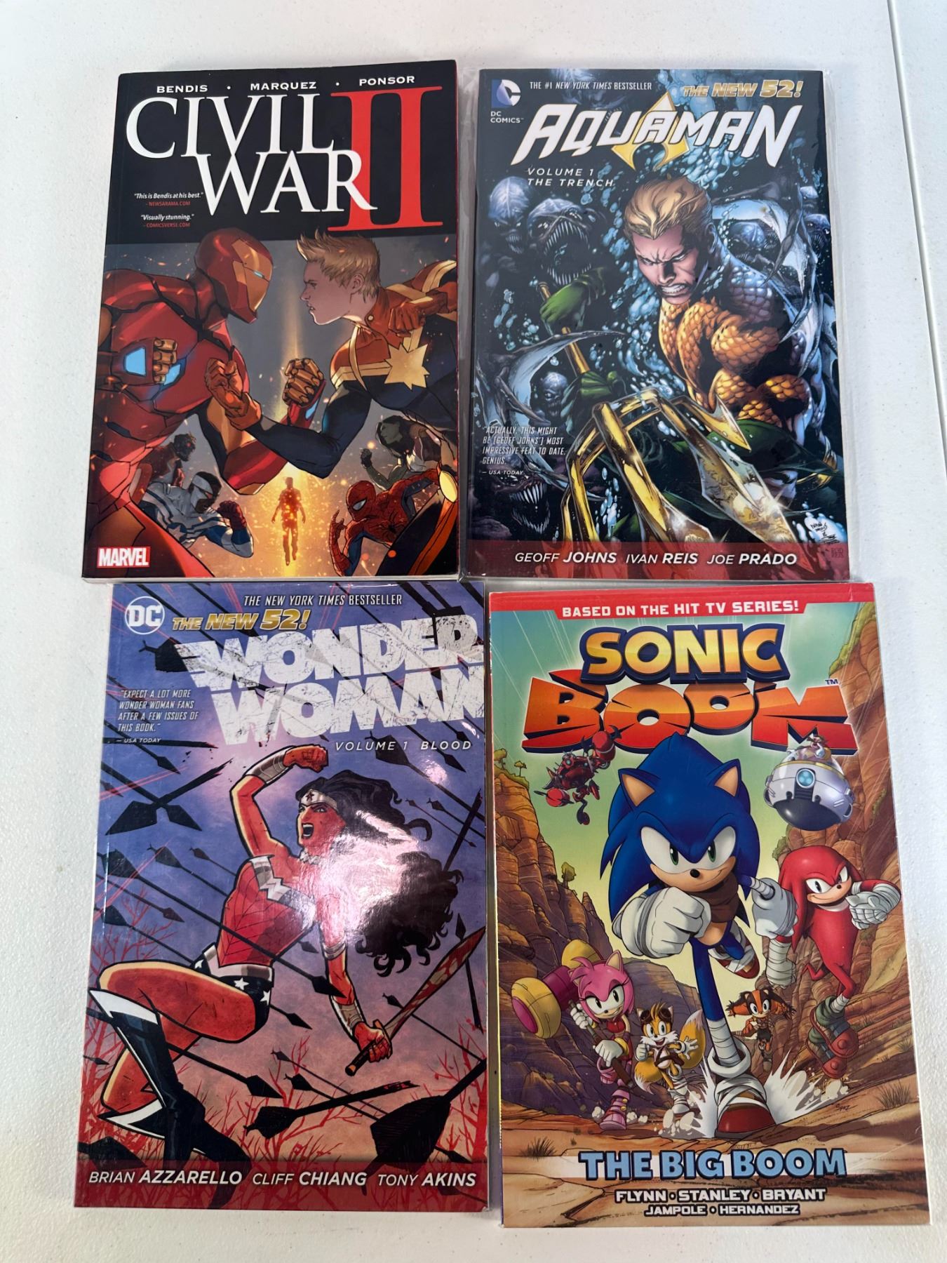 Collection of four graphic novels including Marvel Civil War II, Aquaman Volume 1: The Trench (New 52), Wonder Woman Volume 1: Blood (New 52), and Sonic Boom: The Big Boom. Features a mix of Marvel, DC, and all-ages action titles.