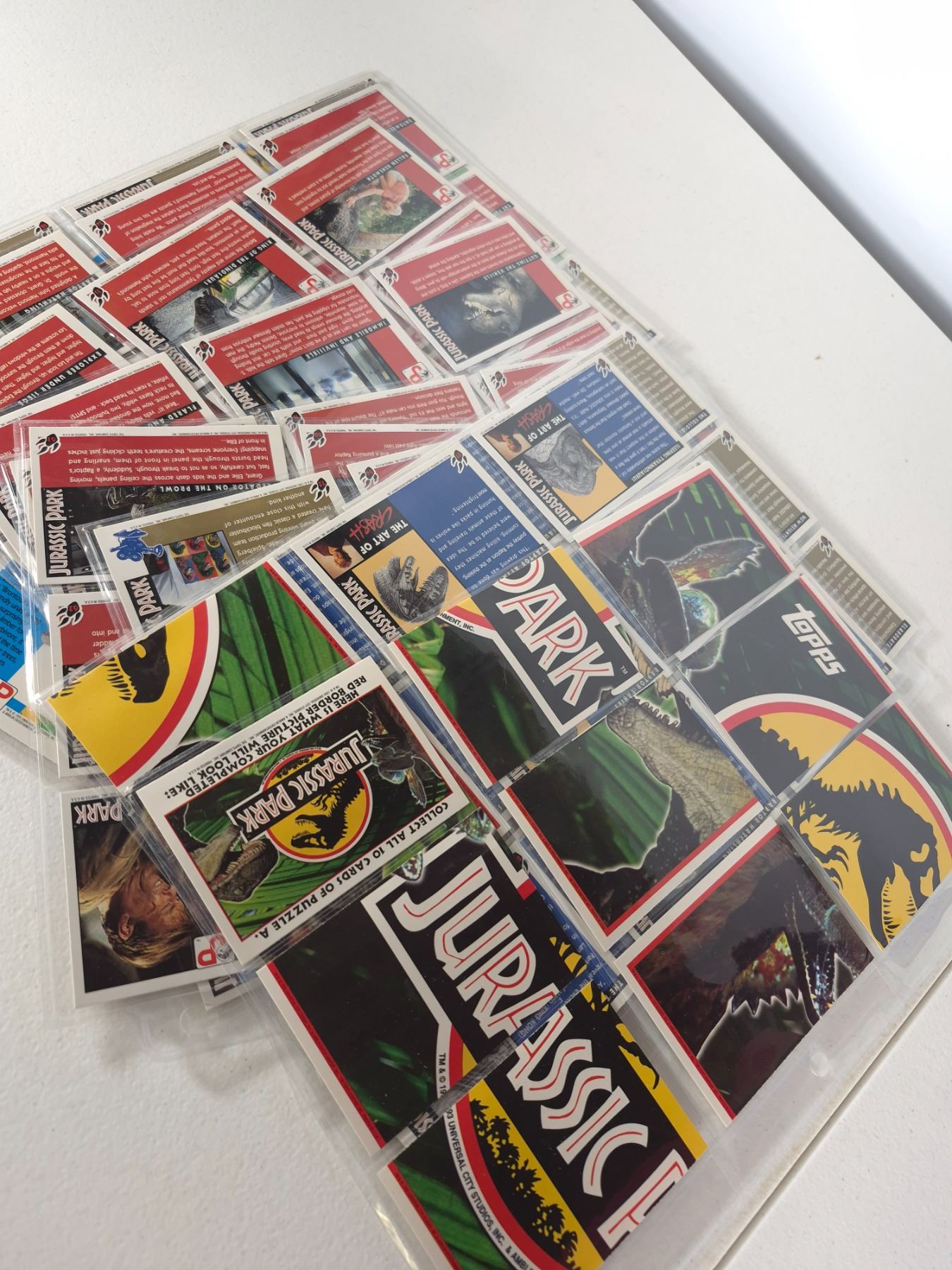 1993 Topps Jurassic Park trading card collection including cards numbered 1-88 along with sticker cards. Features iconic scenes, dinosaurs, and characters from the original Jurassic Park film. Includes Tyrannosaurus Rex, Velociraptor, Dilophosaurus, and more. Appears to be a near-complete or complete set with extras.