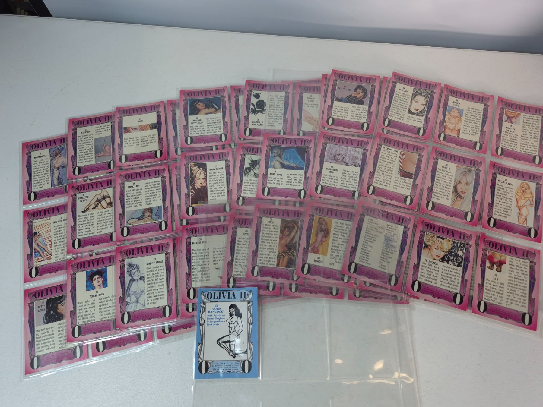 1993 Olivia trading card set including base cards and chrome insert cards. Features pin-up artwork; appears mostly complete with multiple holographic/chrome cards.