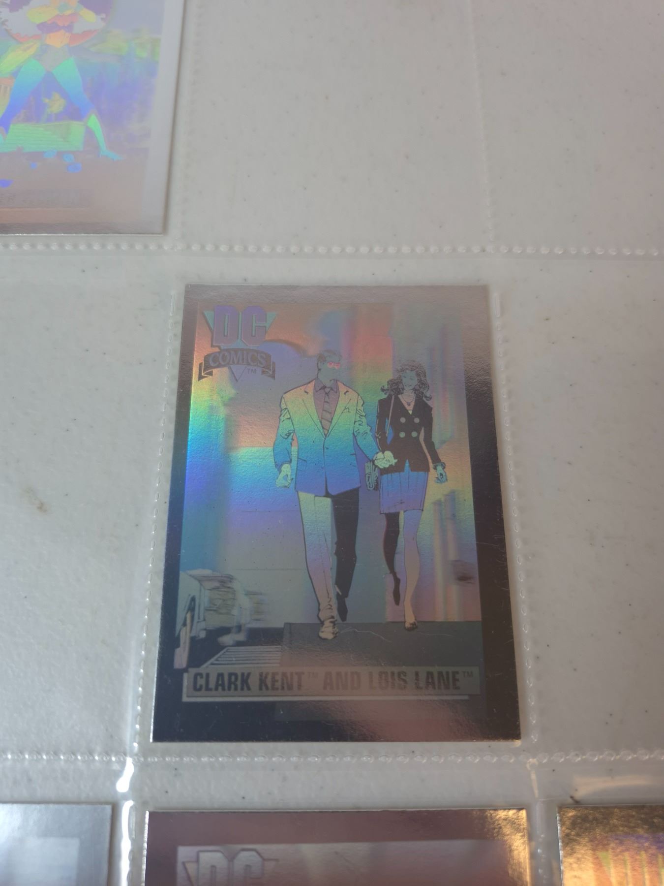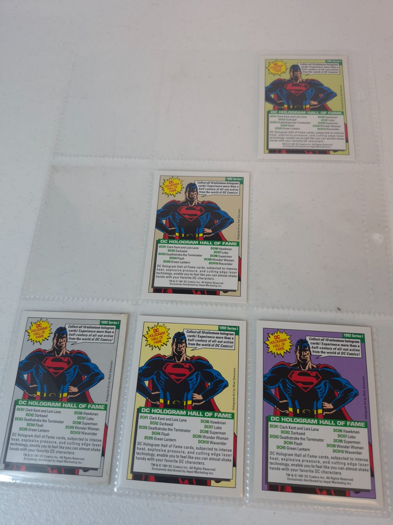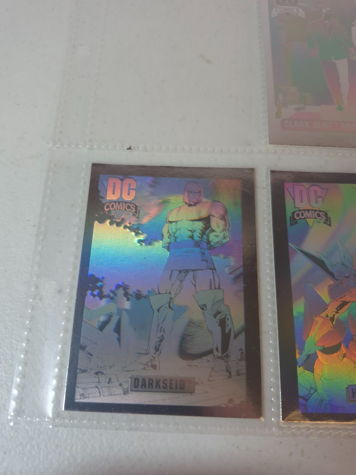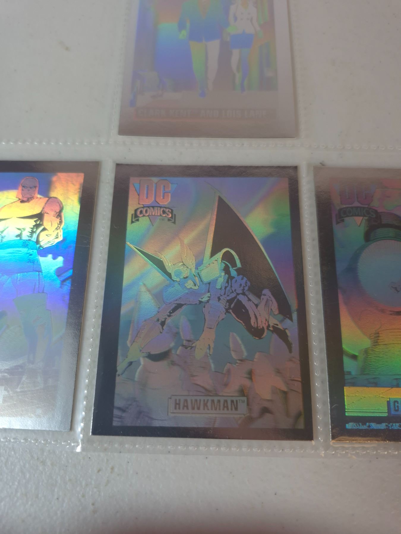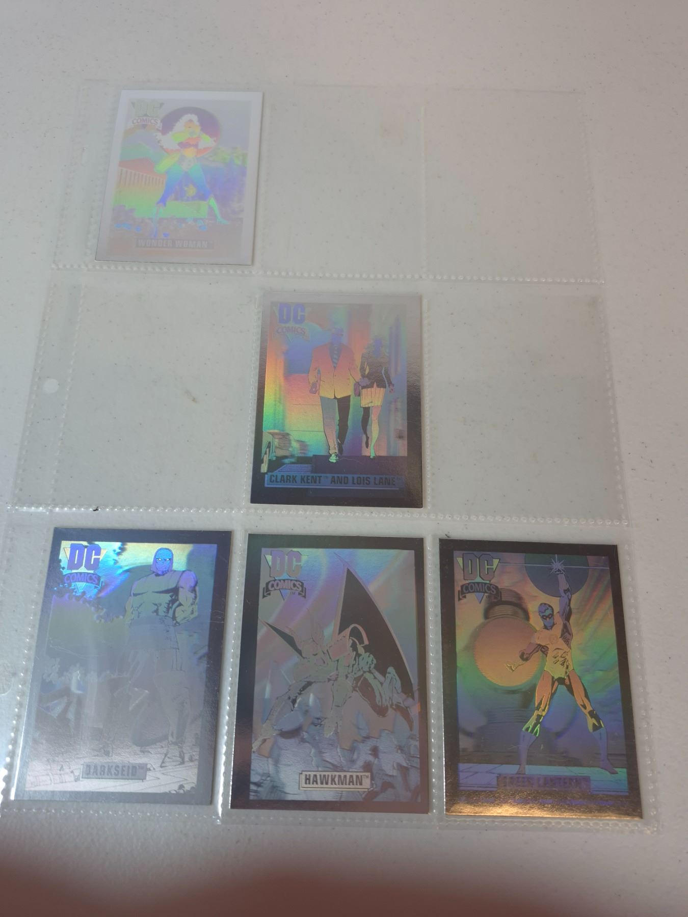 Lot of five 1992 DC Comics hologram trading cards featuring characters including Wonder Woman, Green Lantern, Hawkman, Clark Kent & Lois Lane, and Darkseid. Cards exhibit colorful holographic finishes and are stored in protective sleeves.