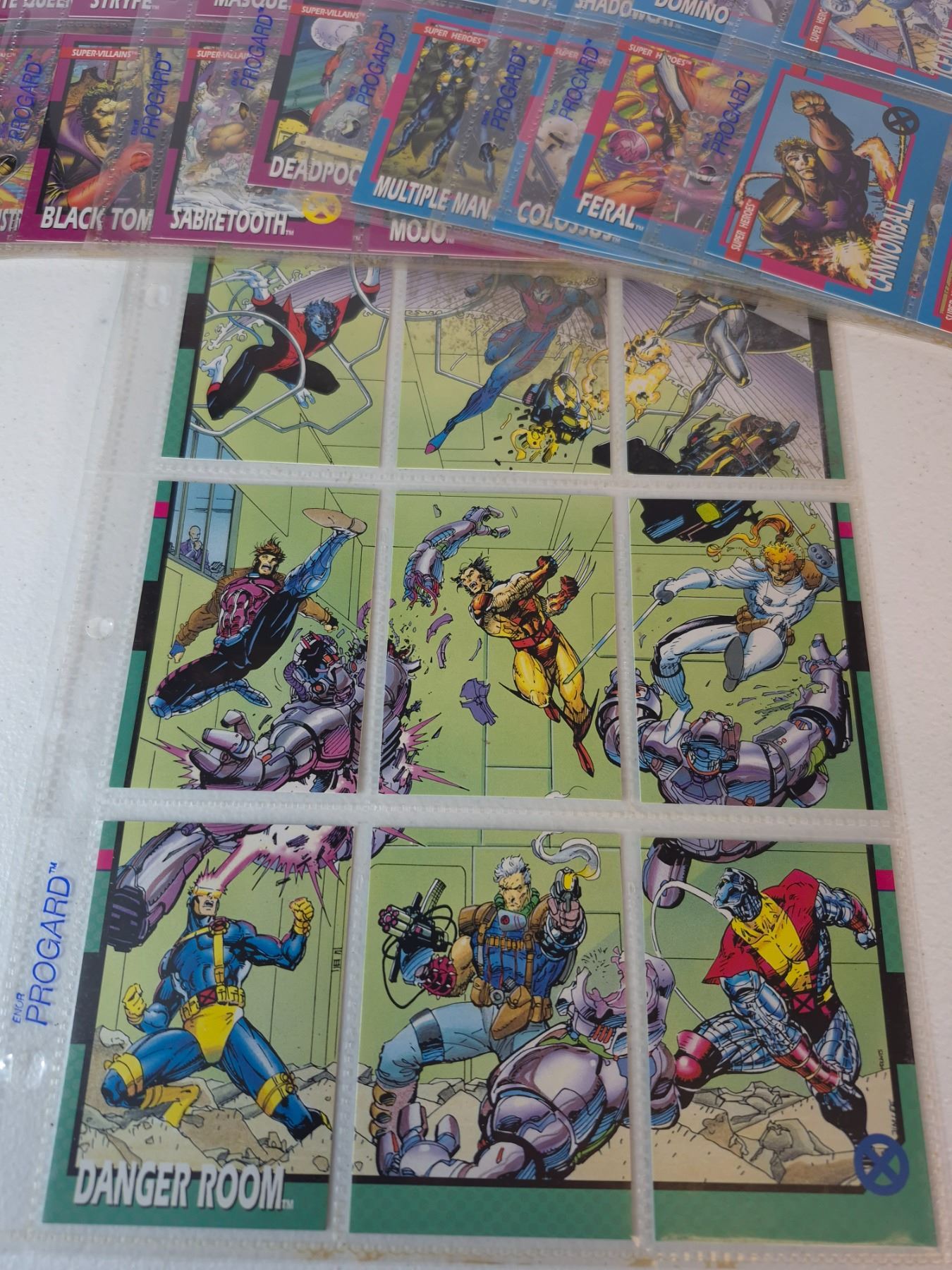 Large collection of 1992 Marvel Universe Series 3 trading cards featuring numerous characters including X-Men, Deadpool, Cable, Phoenix, and more. Lot includes a wide variety of base cards along with specialty cards such as holograms and a multi-card -Danger Room- puzzle set.