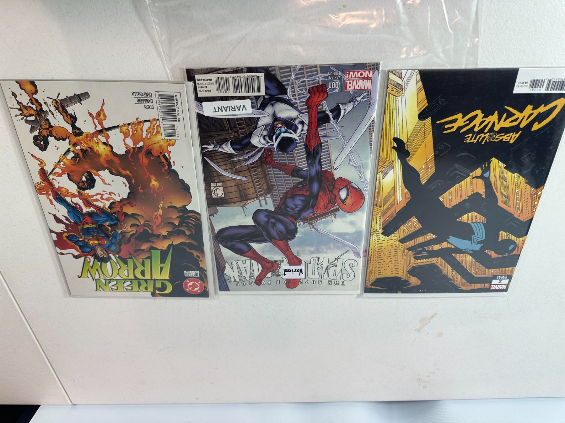 Lot of three modern comic books including Spider-Man (variant cover issue), Absolute Carnage, and Green Arrow. Features popular Marvel and DC characters with dynamic cover art.