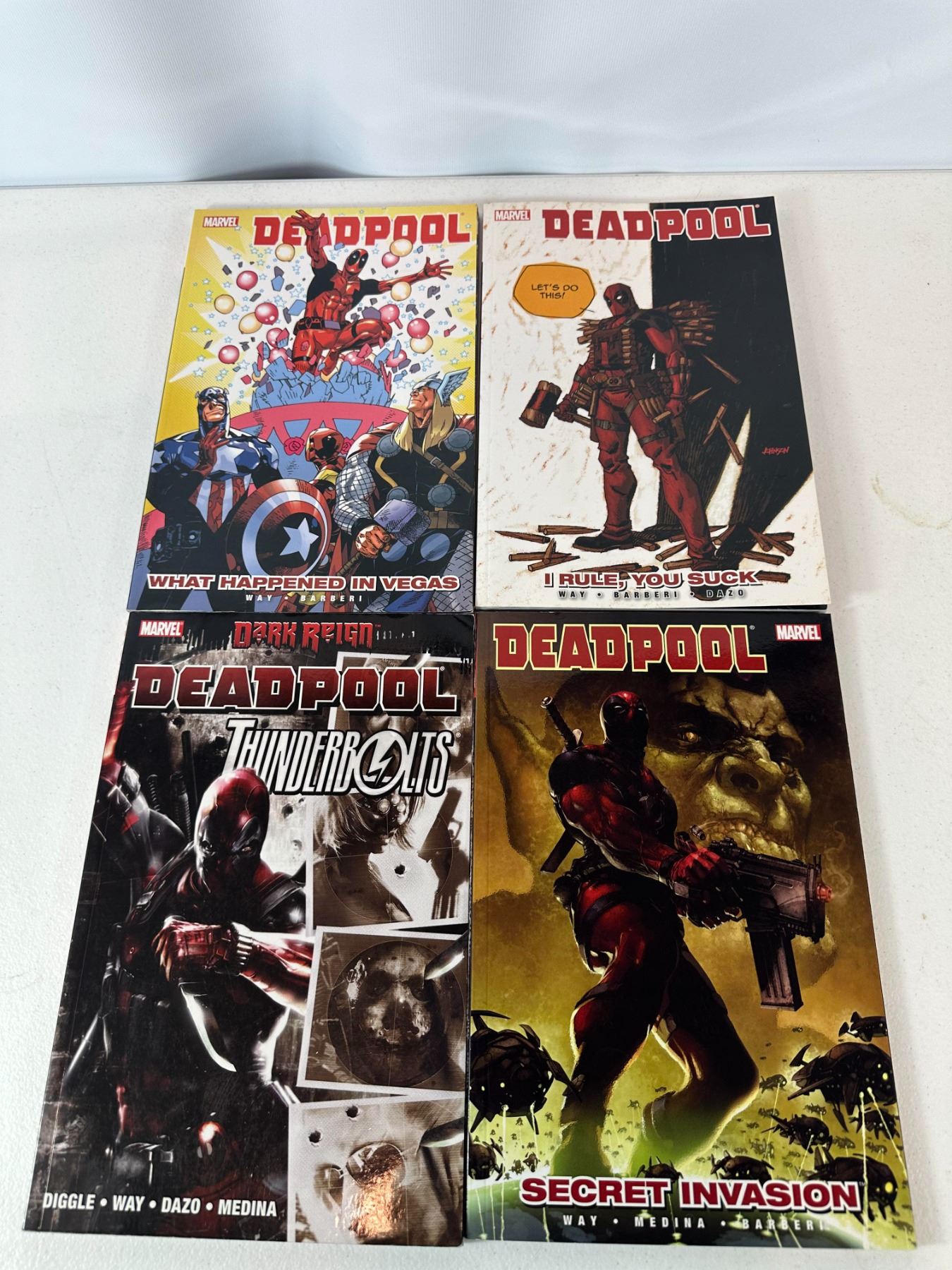 Lot of four Deadpool graphic novels including 'Secret Invasion', 'Thunderbolts' (Dark Reign), 'What Happened in Vegas', and 'I Rule, You Suck'. Features multiple story arcs starring the popular anti-hero.
