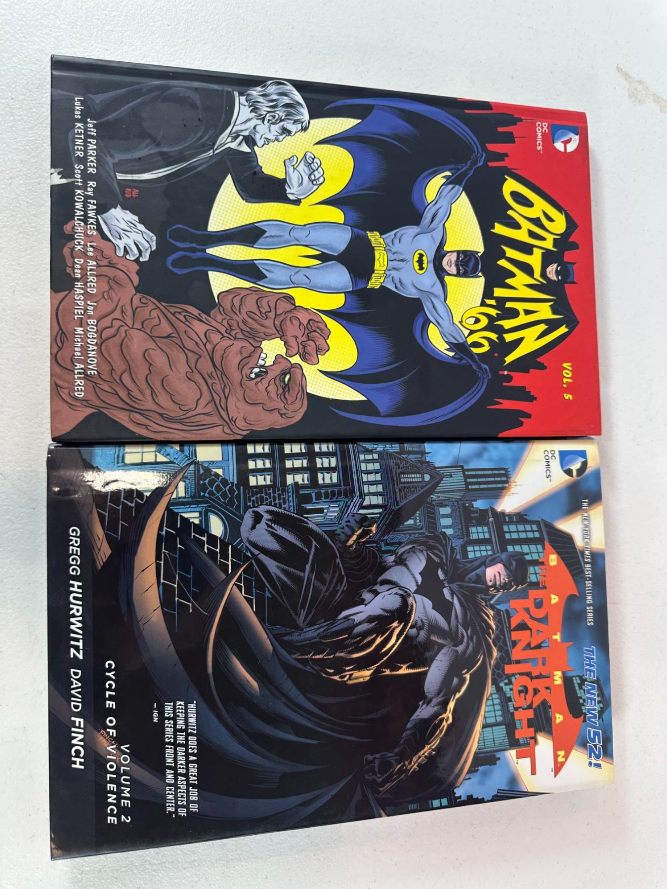Lot of two DC Comics Batman graphic novels including 'Batman -66 Vol. 5', inspired by the classic 1960s TV series featuring colorful retro-style adventures, and 'Batman: The Dark Knight Vol. 2 - Cycle of Violence (The New 52)' by Gregg Hurwitz and David Finch. Includes a mix of classic campy storytelling and darker modern Batman themes.
