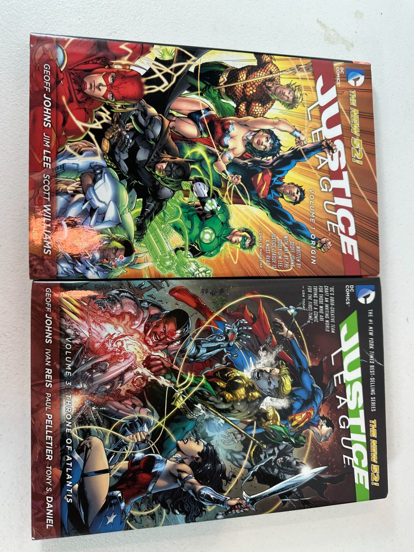 Lot of two DC Comics graphic novels from The New 52 era including 'Justice League Vol. 1: Origin' by Geoff Johns and Jim Lee, and 'Justice League Vol. 3: Throne of Atlantis' by Geoff Johns, Ivan Reis, and Paul Pelletier. Features the formation of the Justice League and the major Atlantis crossover storyline involving Aquaman.