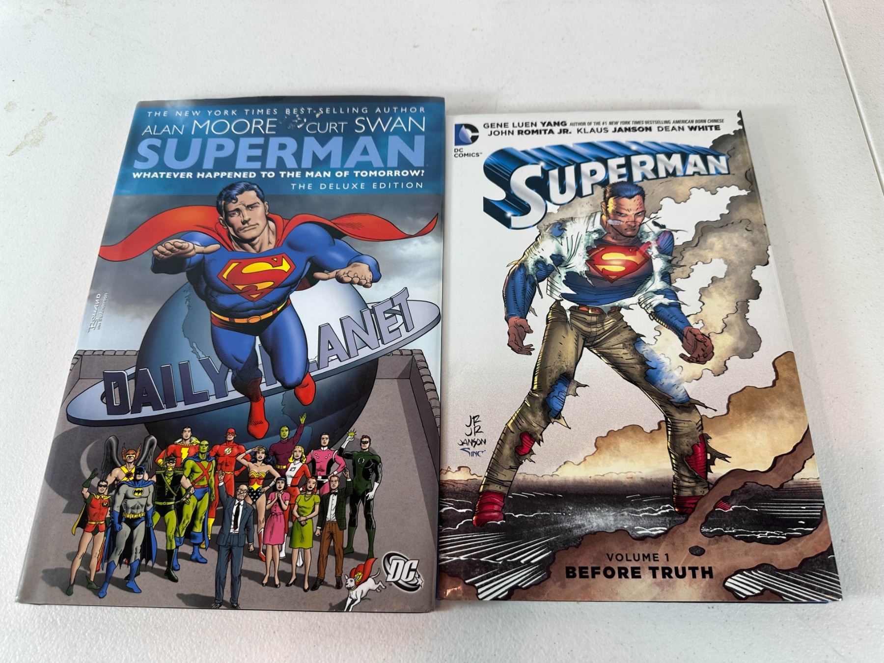 Lot of two Superman graphic novels including 'Superman: Whatever Happened to the Man of Tomorrow? The Deluxe Edition' by Alan Moore and Curt Swan, a classic and highly regarded storyline, and 'Superman Vol. 1: Before Truth' by Gene Luen Yang and John Romita Jr., featuring a modern era Man of Steel arc.