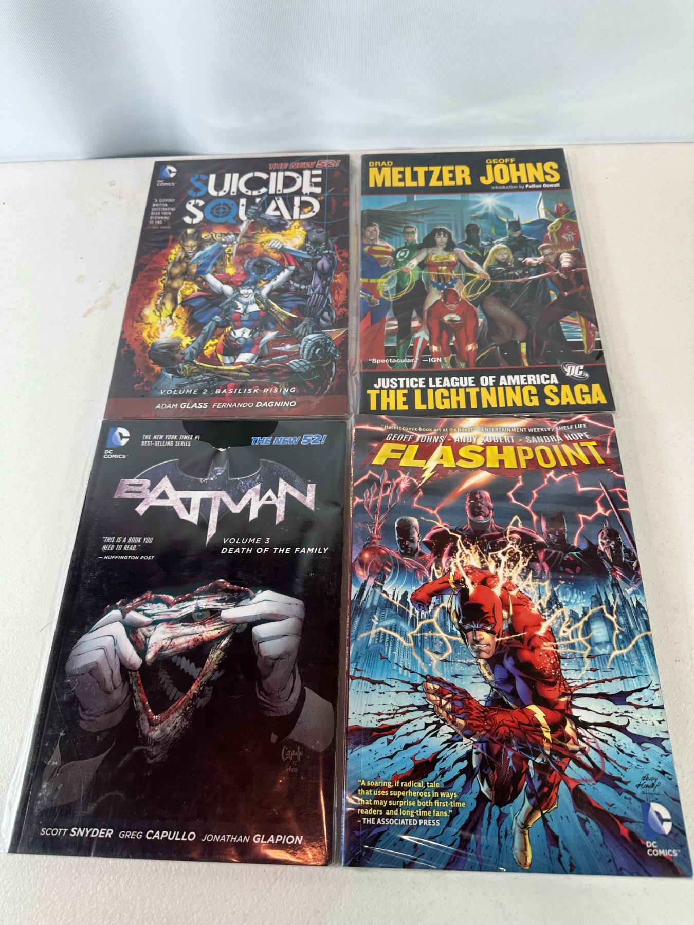Lot of four DC Comics graphic novels including 'Flashpoint' by Geoff Johns and Andy Kubert, 'Batman Vol. 3: Death of the Family' by Scott Snyder and Greg Capullo, 'Suicide Squad Vol. 2: Basilisk Rising (The New 52)' by Adam Glass, and 'Justice League of America: The Lightning Saga' by Brad Meltzer and Geoff Johns. Features major DC storylines including Flashpoint event, Joker arc, and Suicide Squad missions.