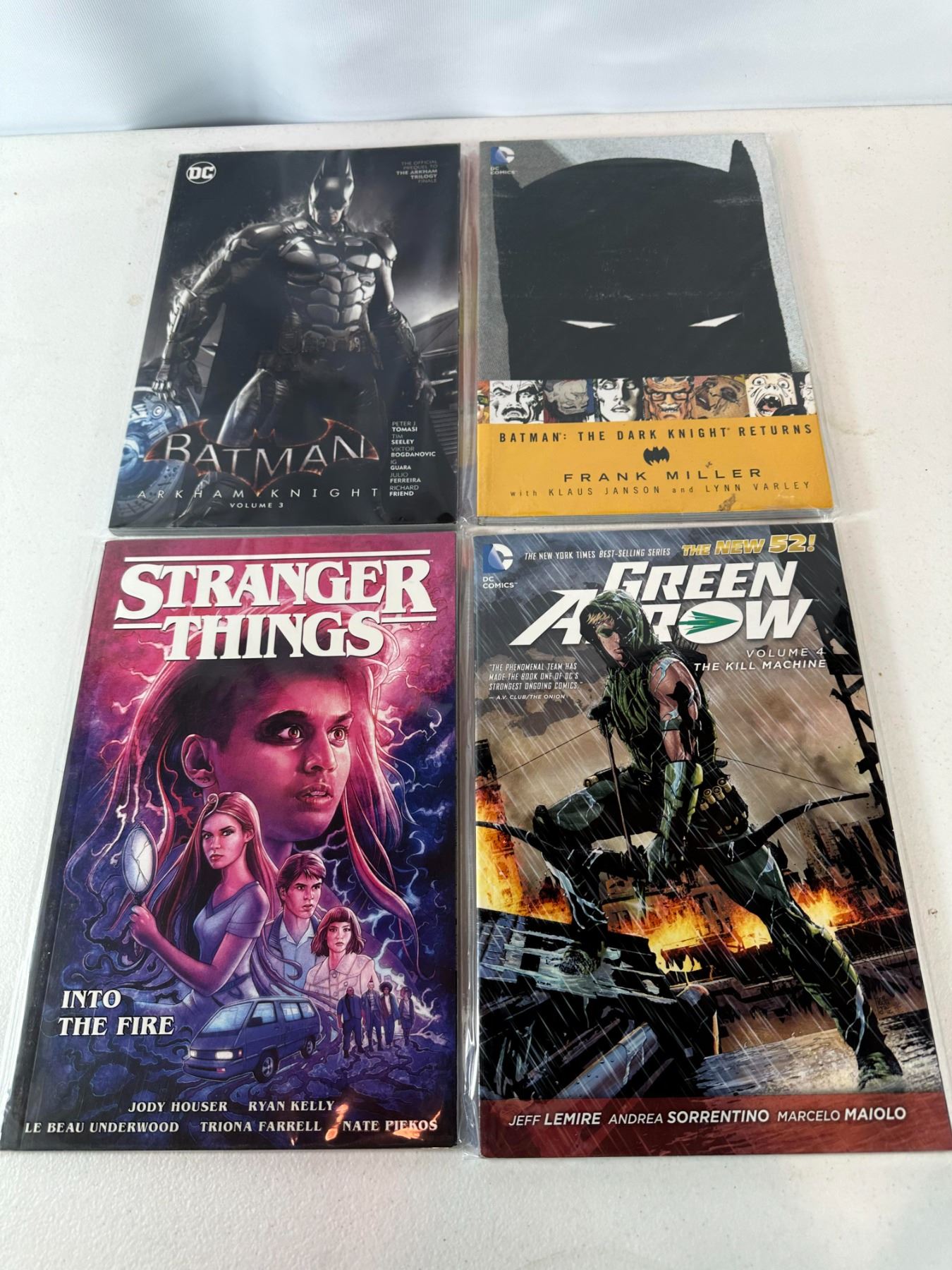 Lot of four graphic novels including 'Batman: Arkham Knight Vol. 3', 'Batman: The Dark Knight Returns' by Frank Miller, 'Stranger Things: Into the Fire', and 'Green Arrow Vol. 4: The Kill Machine (The New 52)' by Jeff Lemire and Andrea Sorrentino. Includes a mix of classic Batman stories, modern DC titles, and a popular Stranger Things comic.