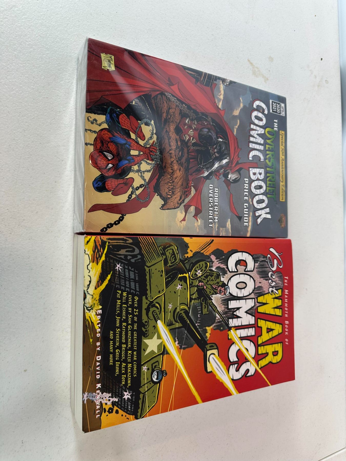 Lot of two comic-related books including the Overstreet Comic Book Price Guide 2020-2021 edition by Robert M. Overstreet and The Mammoth Book of Best War Comics edited by David Kendall. Includes collectible pricing reference and classic war comic stories.
