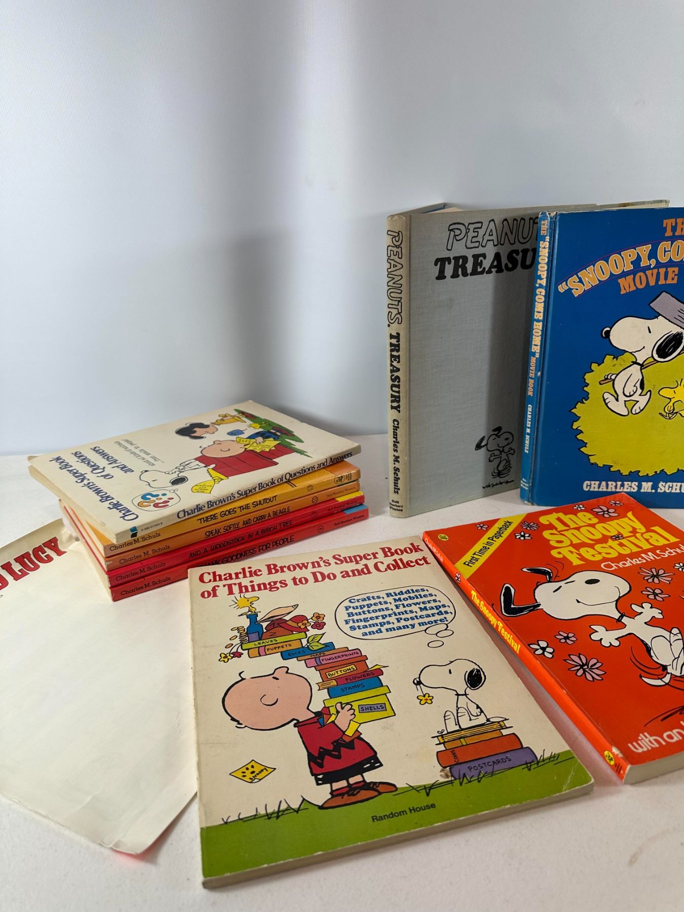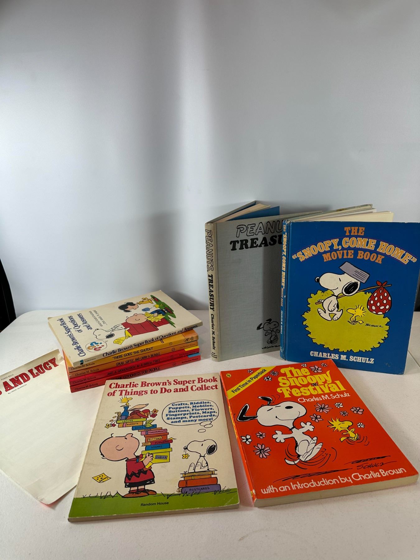 Mixed lot of Peanuts books by Charles M. Schulz including Snoopy Come Home movie book, Peanuts Treasury hardcover, The Snoopy Festival, and Charlie Brown activity/story books. Includes both hardcover and paperback editions.