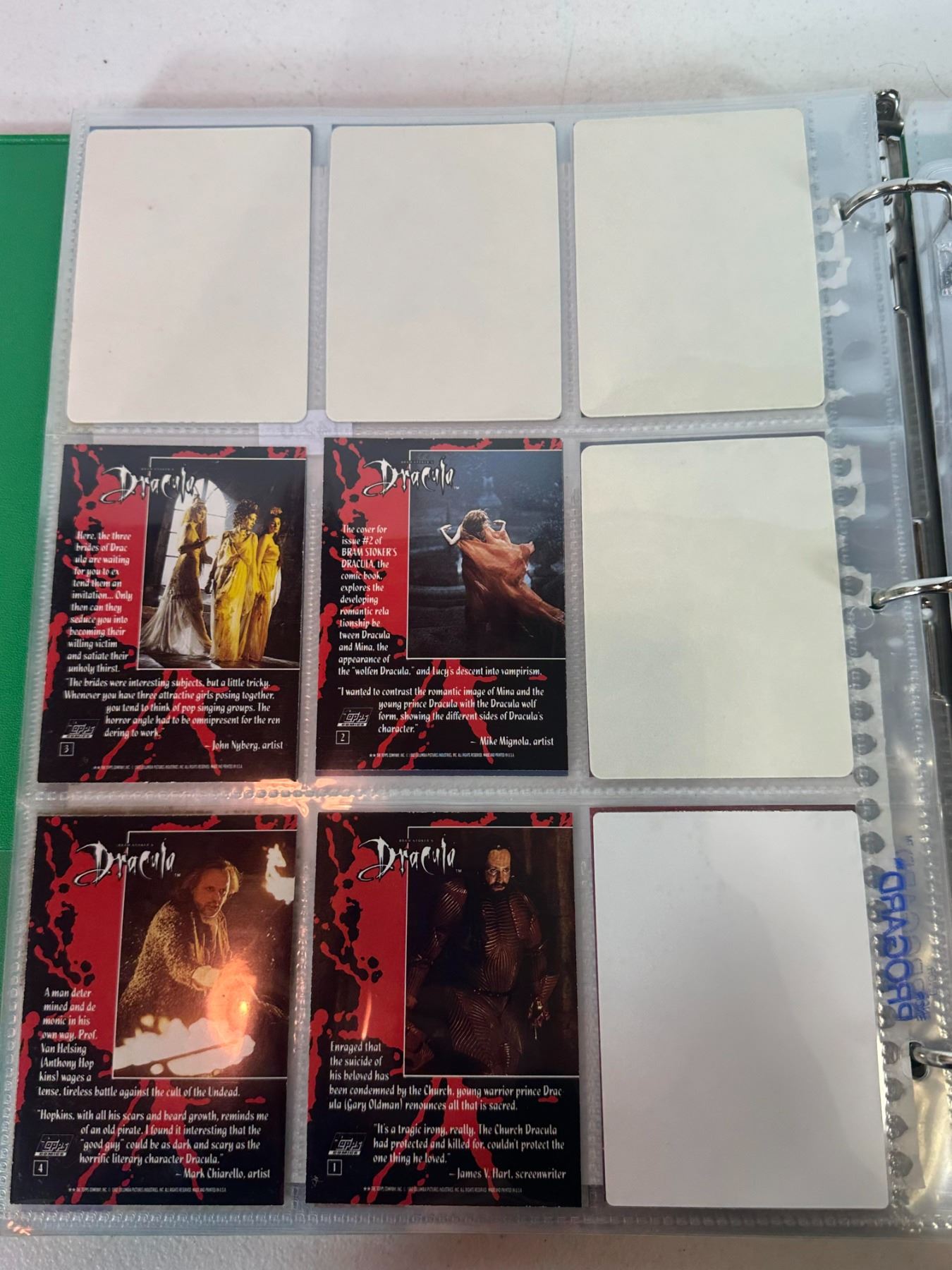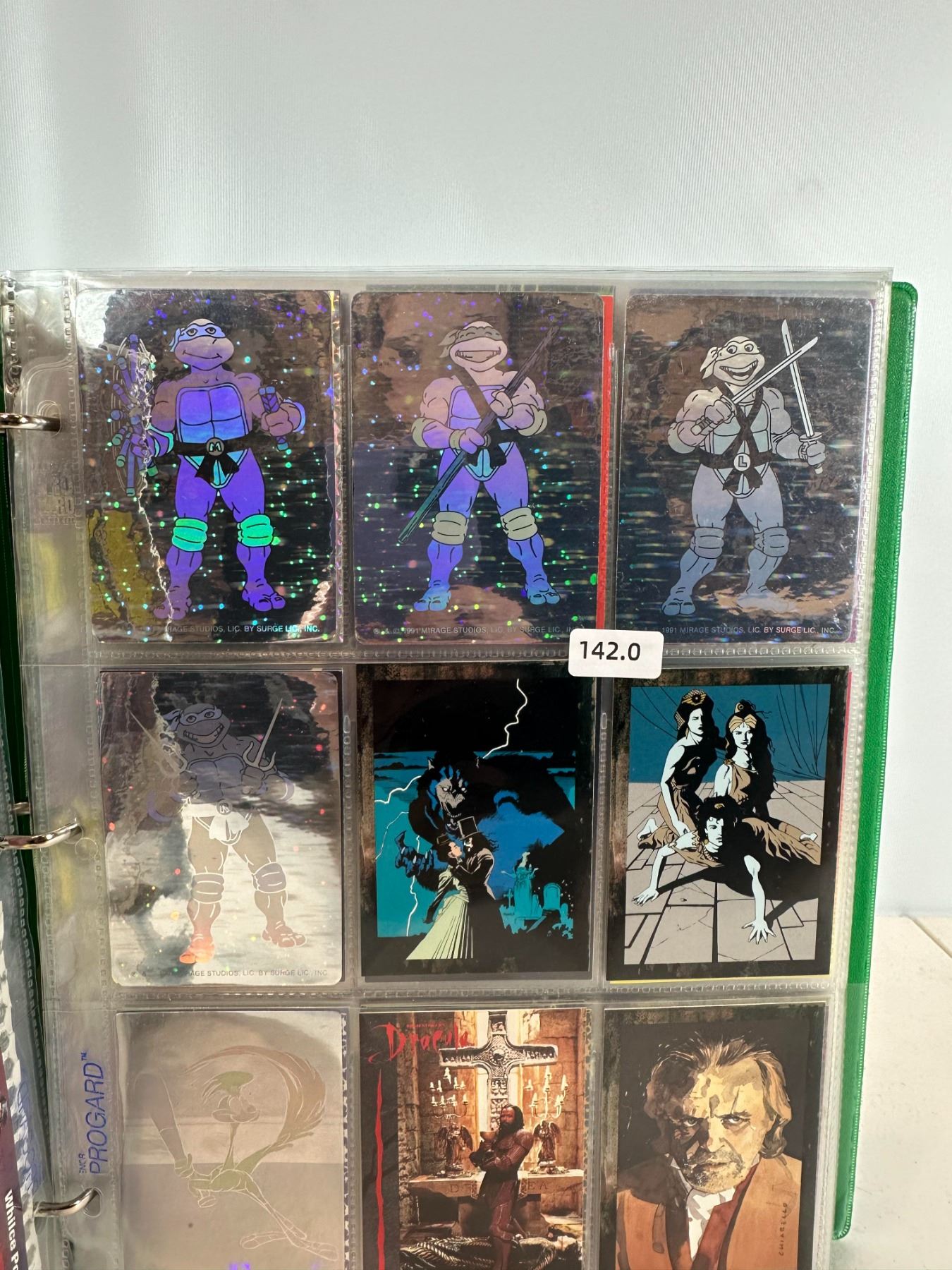 Binder page featuring Teenage Mutant Ninja Turtles hologram trading cards along with assorted movie and character cards (including Dracula and other illustrated subjects).