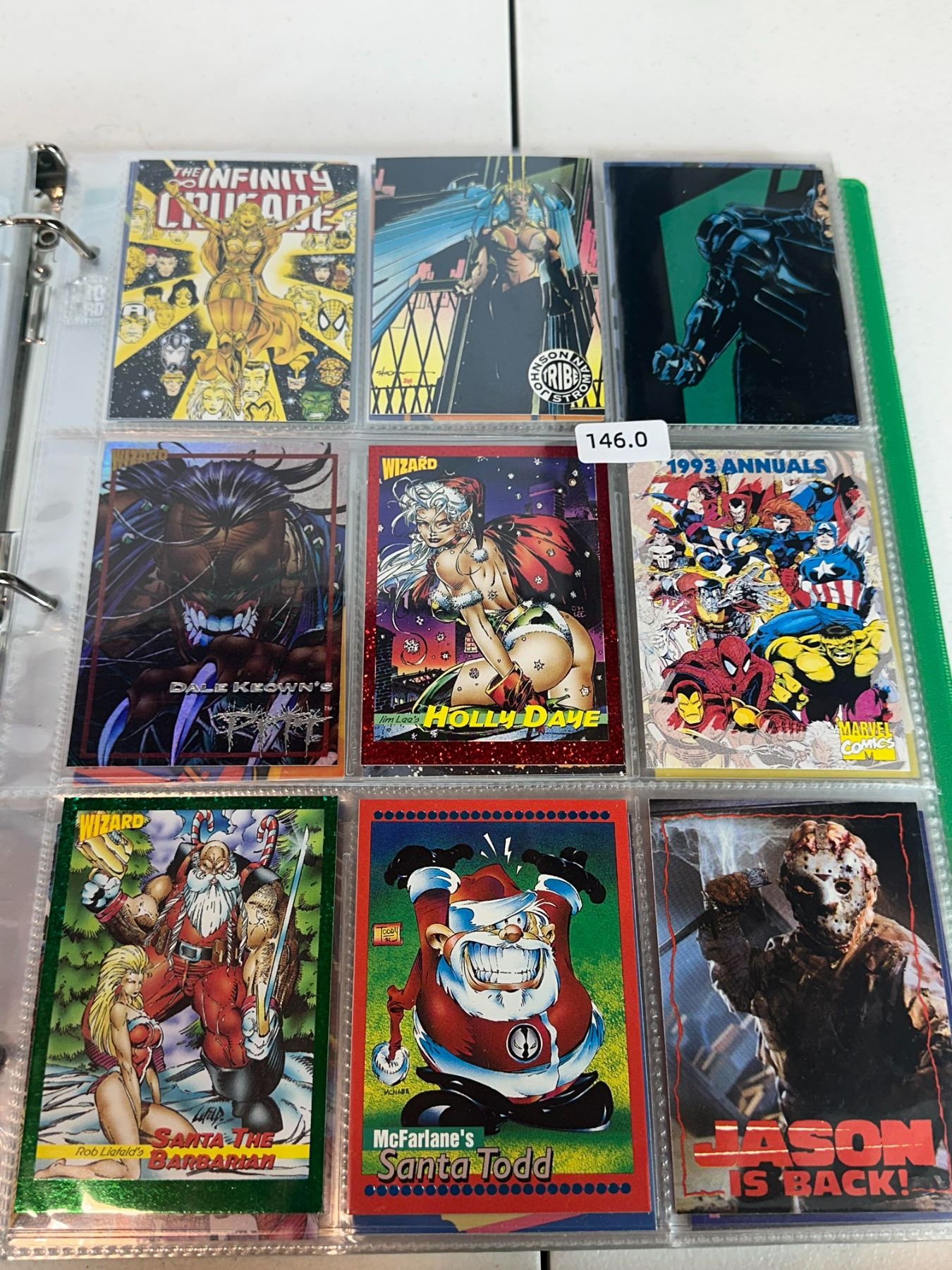 Lot 146 Mixed Trading Card Binder Page Lot (Wizard Promos, Marvel Annuals, Santa Cards, Jason)