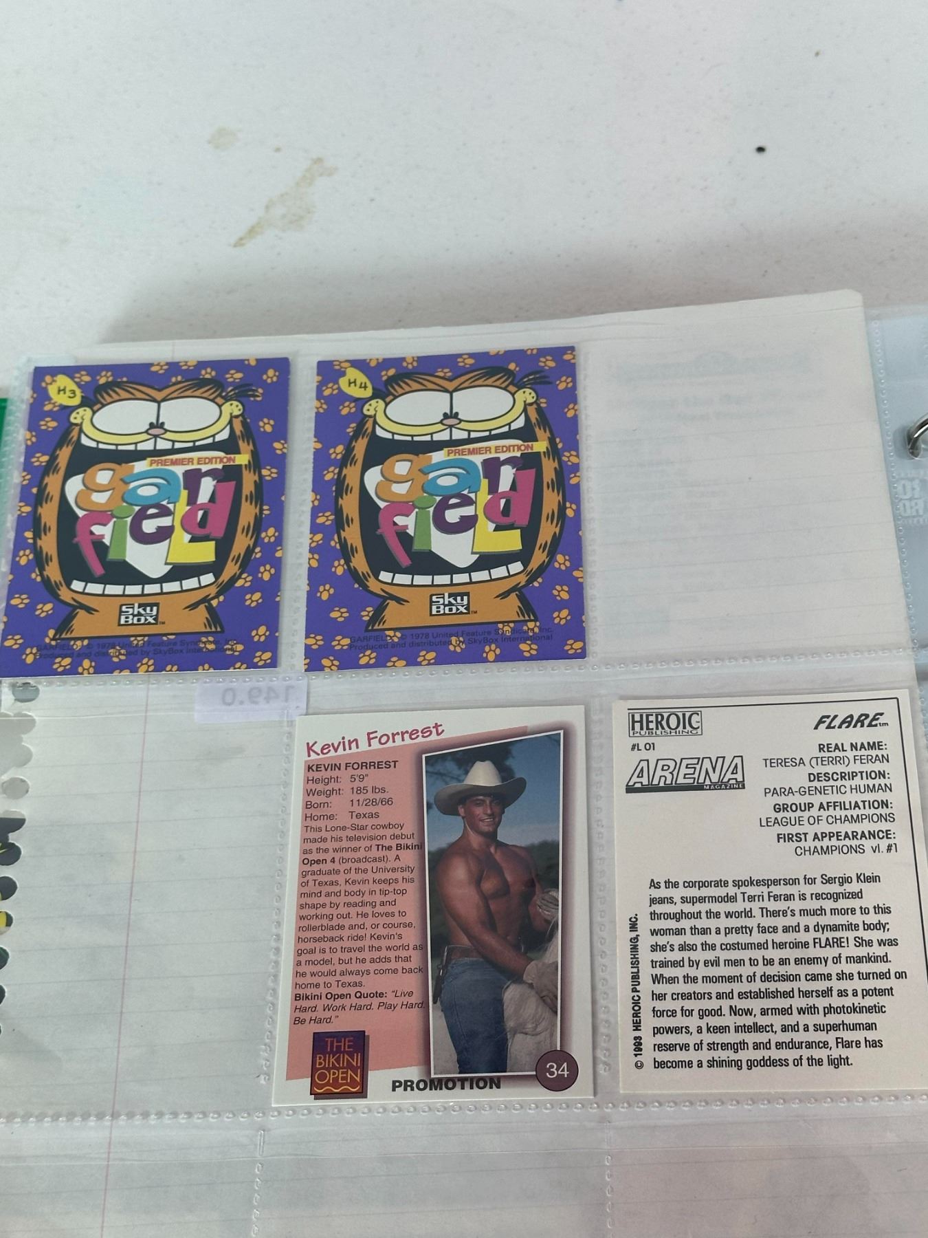 Binder page with mixed trading cards including holographic Garfield letter cards, Flare comic character card, Kevin Forrest 'The Bikini Open' card, and assorted inserts. Partially filled 9-pocket page. Mixed publishers.