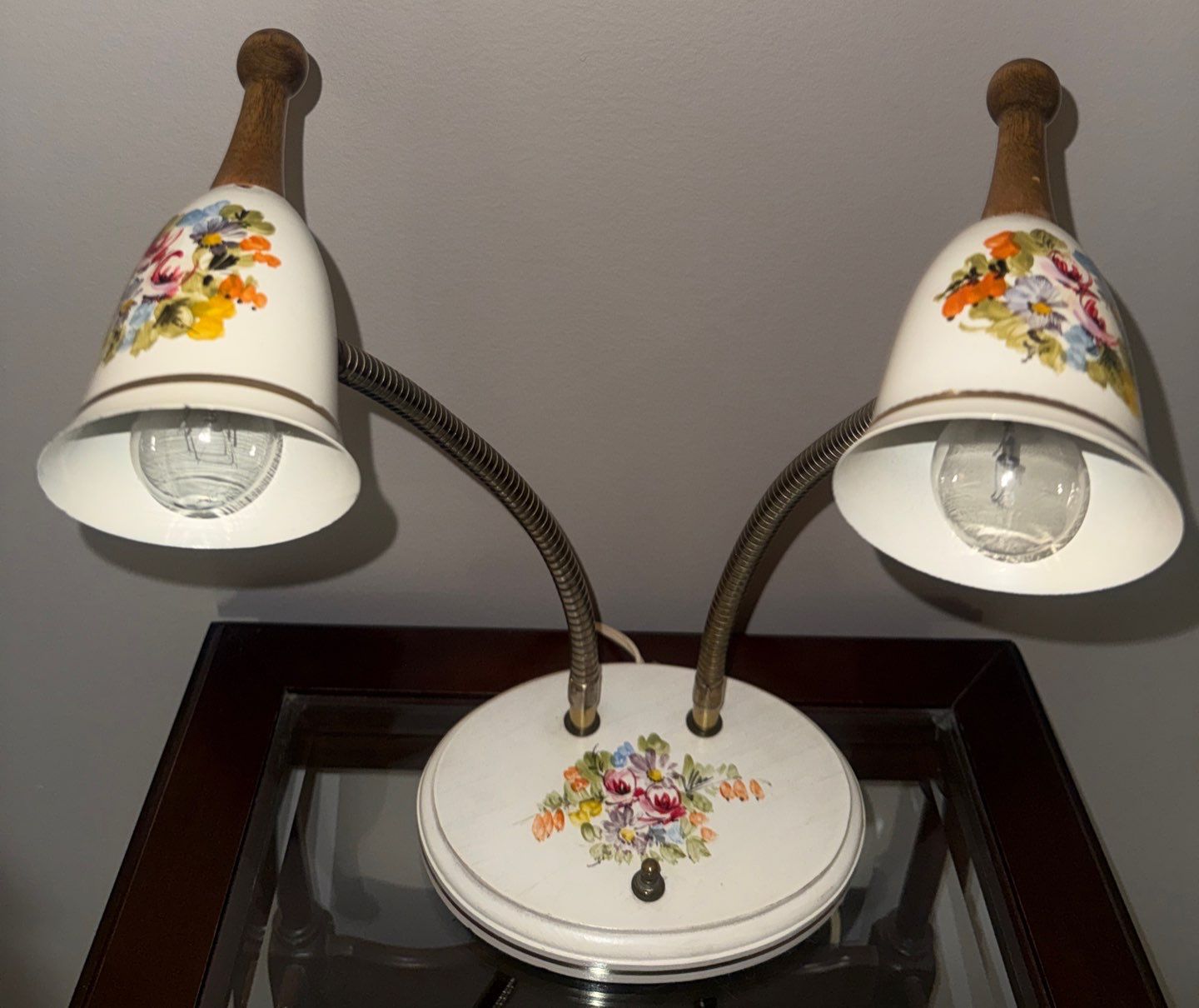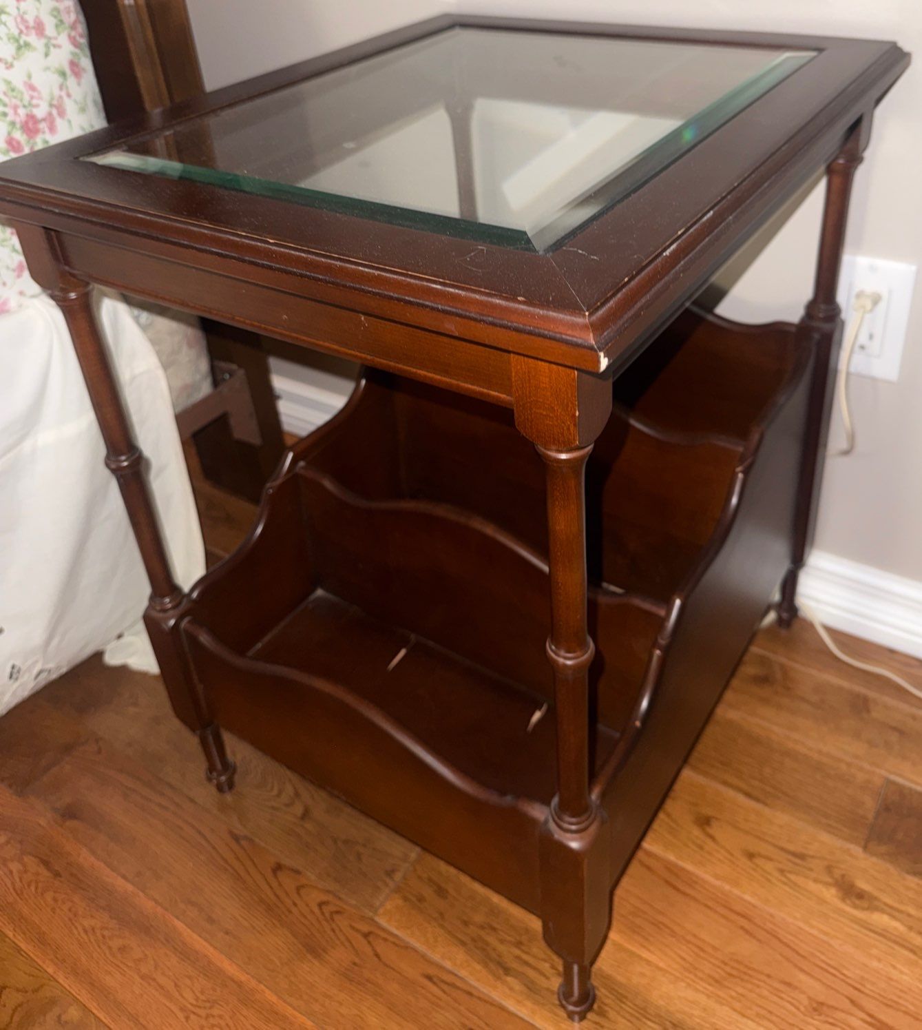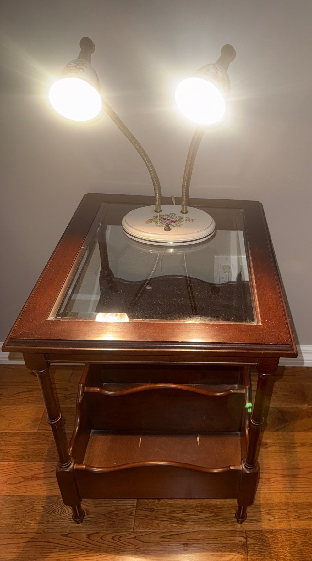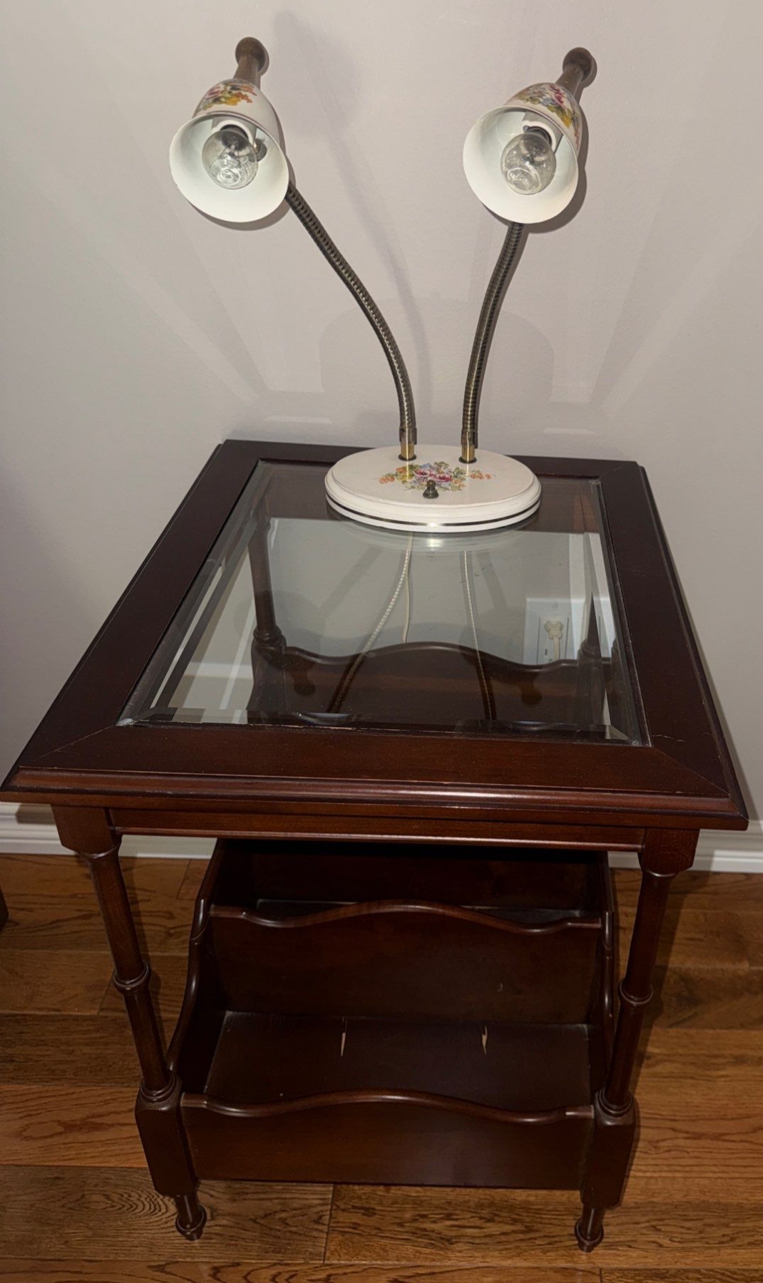 Lot 71 Mahogany Glass Top Multi Tiered End Table 24x25x25 w/ Vintage 2 Light Lamp