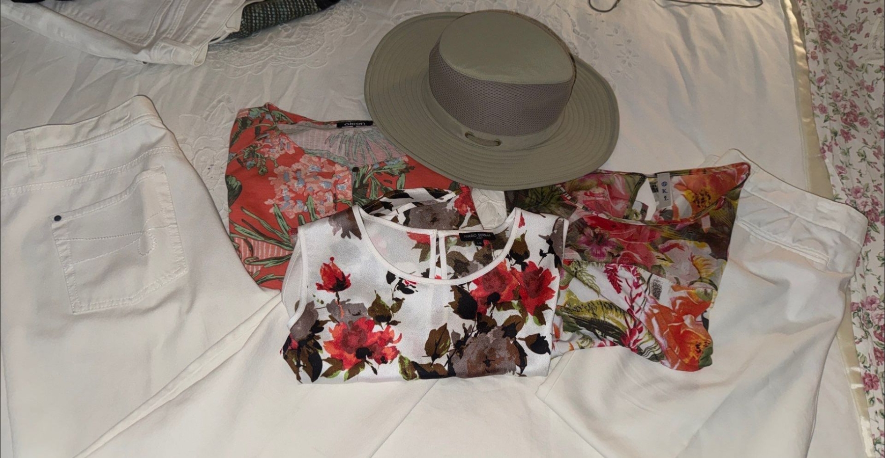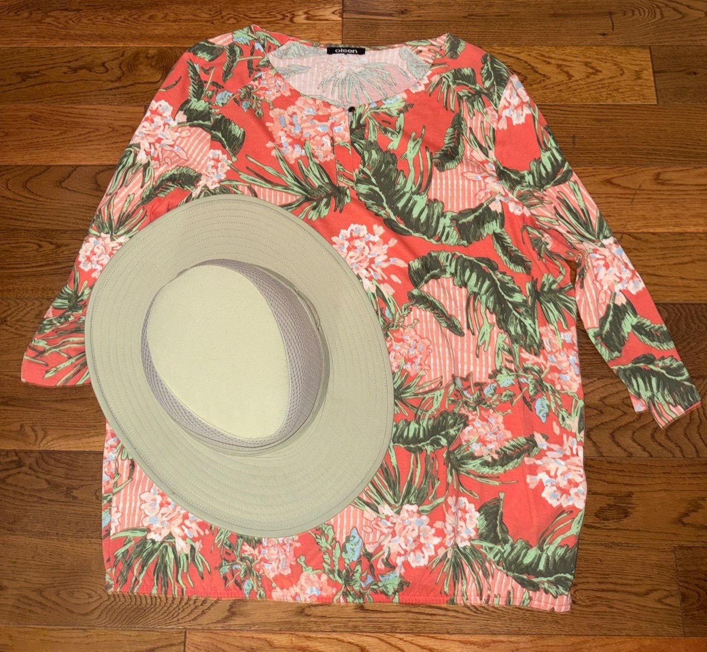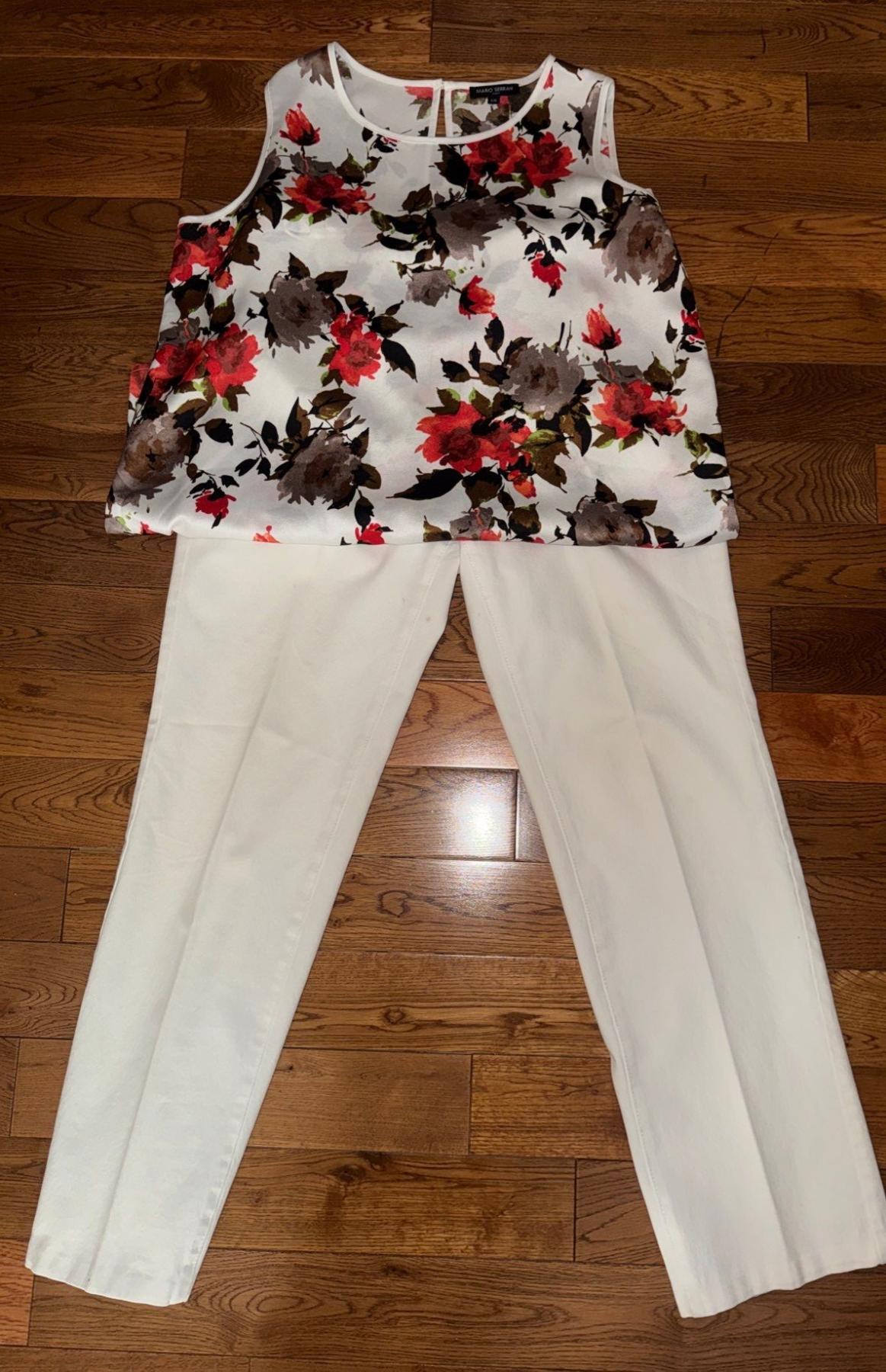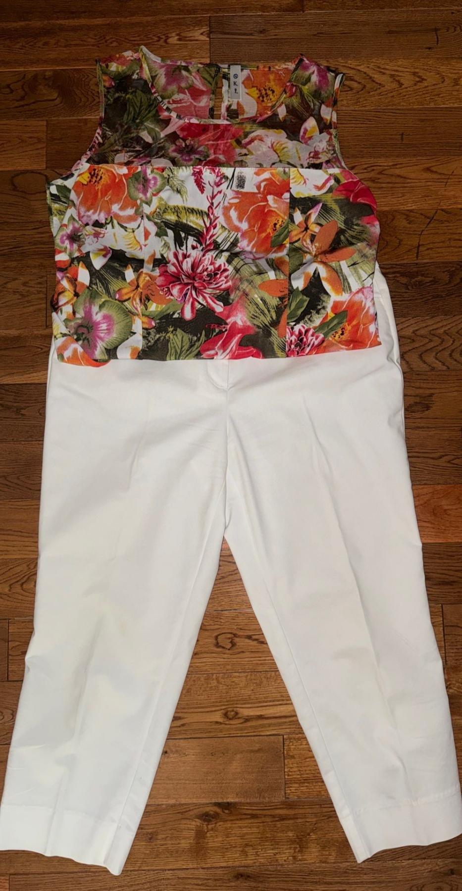 Lot 73 White Slacks w/ Floral Print Tops & New Sun Hat - Ladies Size L