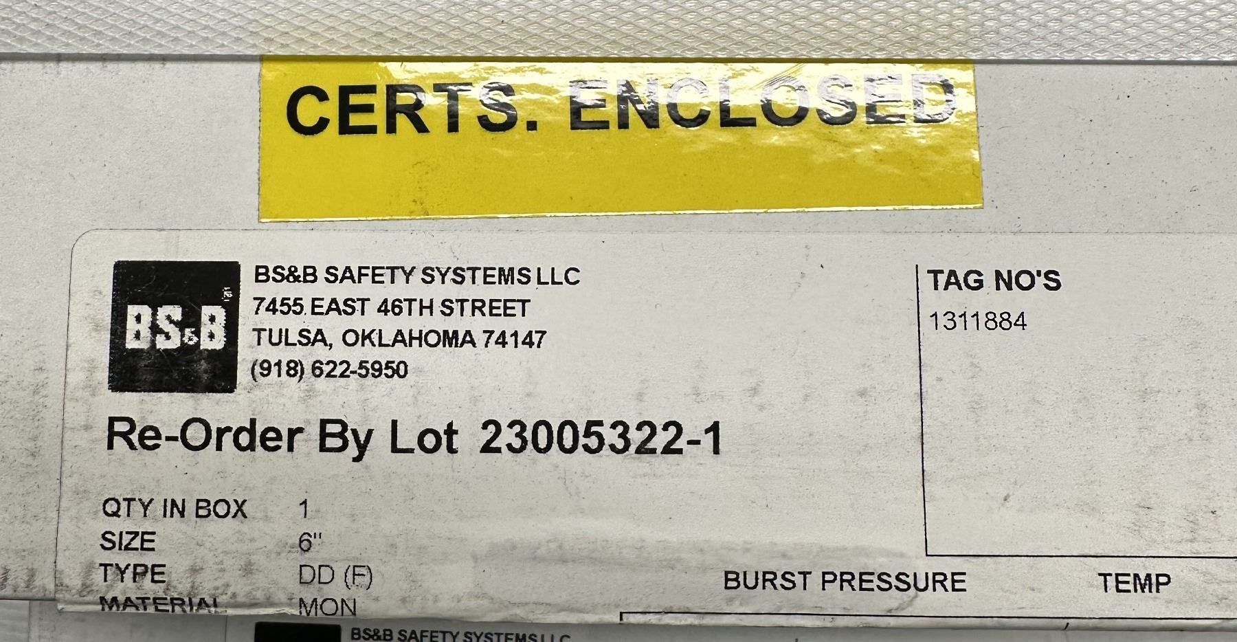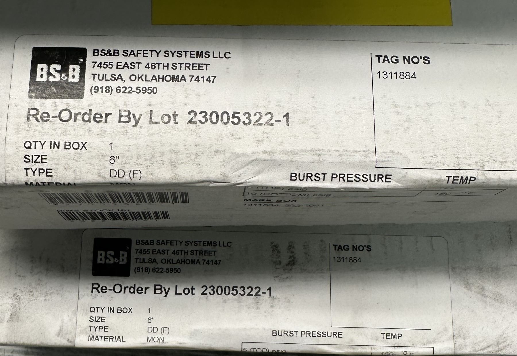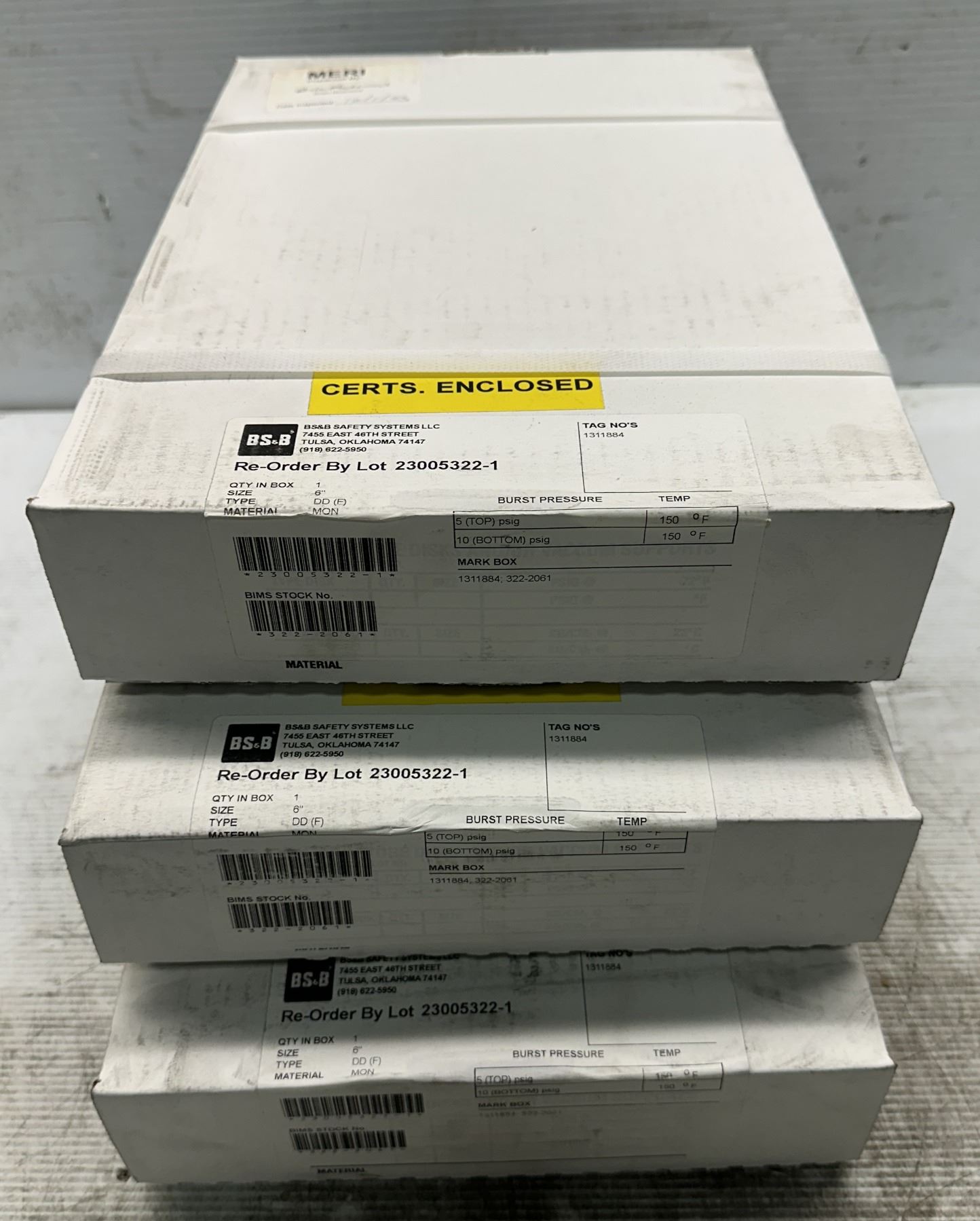 Lot 802 (3) BS&B Safety #23005322-1 Rupture Disc Burst Pressure 5(Top)psig 10(Bottom) psig @ 150 Degrees