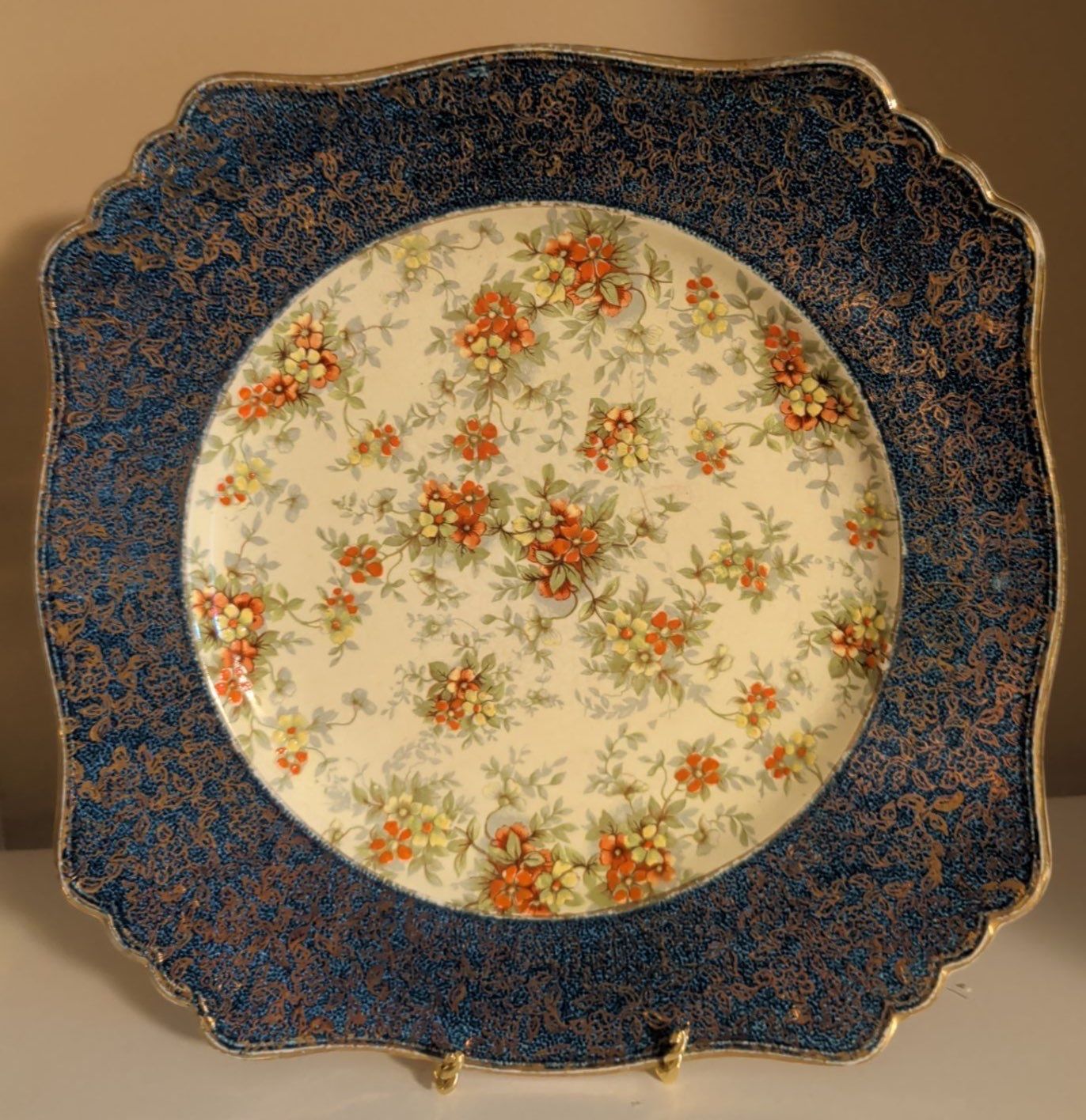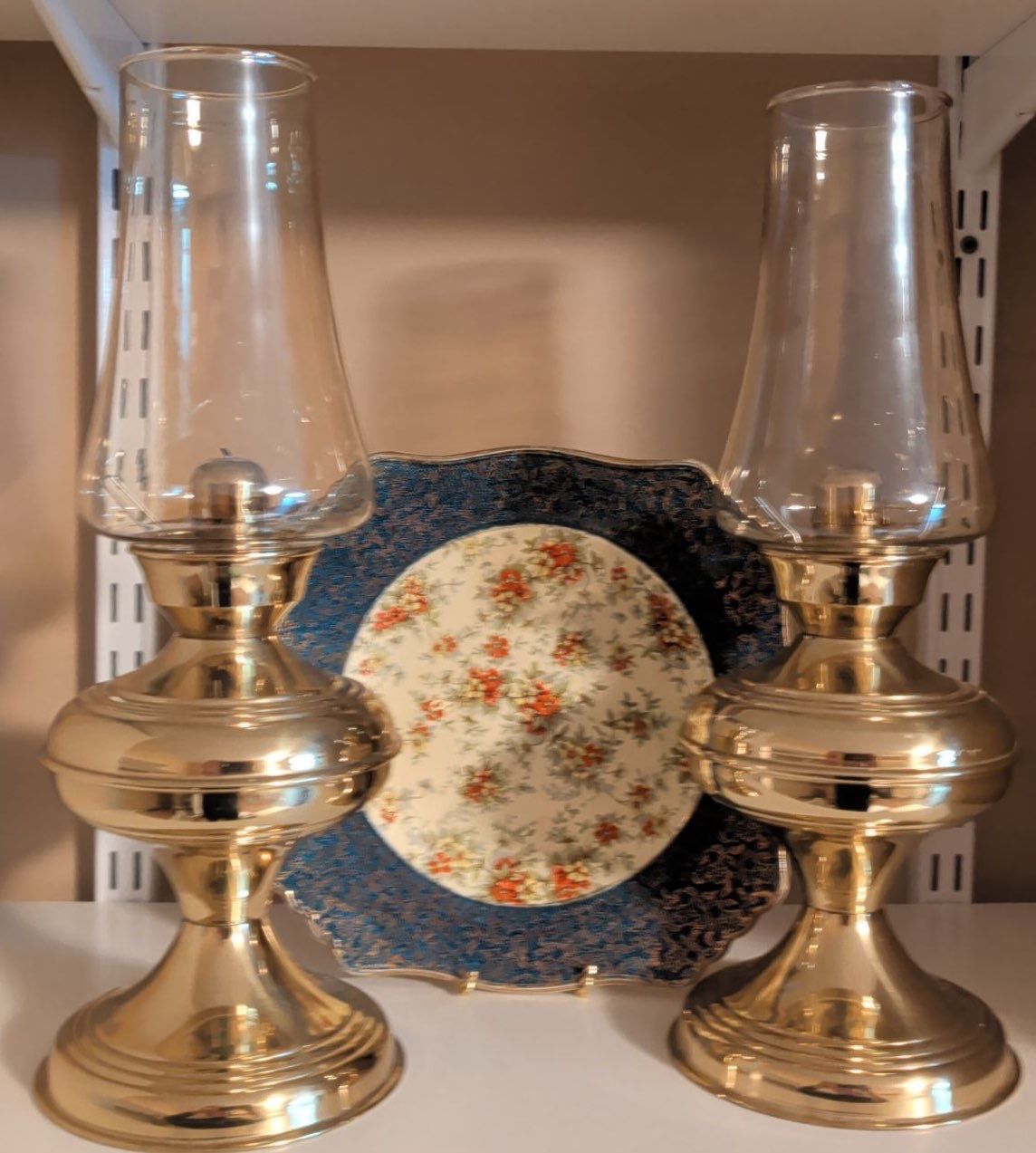 Lot 96 2 Hurricane Style Brass Lamps w/ Royal Winton Decorative Floral Plate