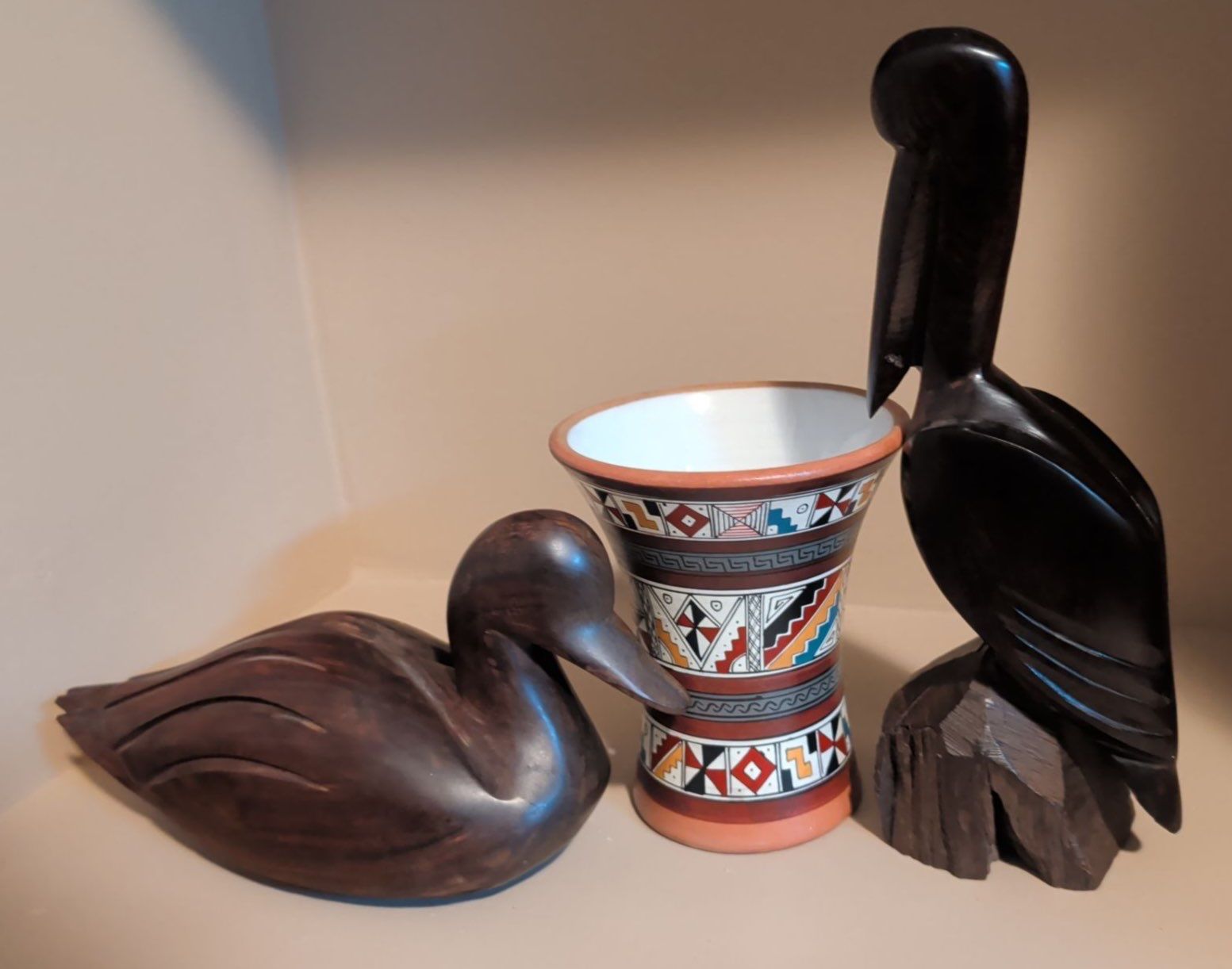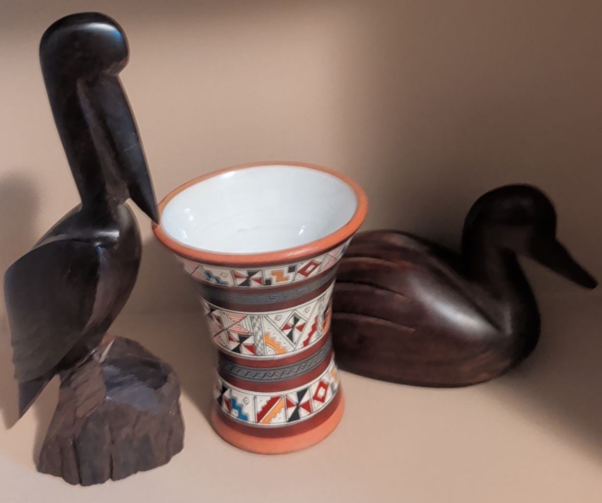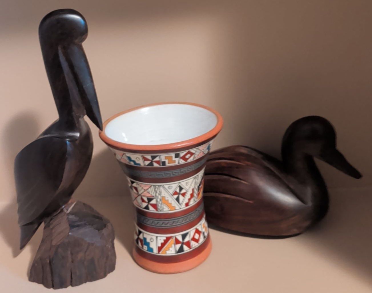 Lot 98 Artisinal Decor - Hand Carved Mahogany Pelican & Duck Decoy w/ Peruvian Redware Pottery Vase 8"Tall