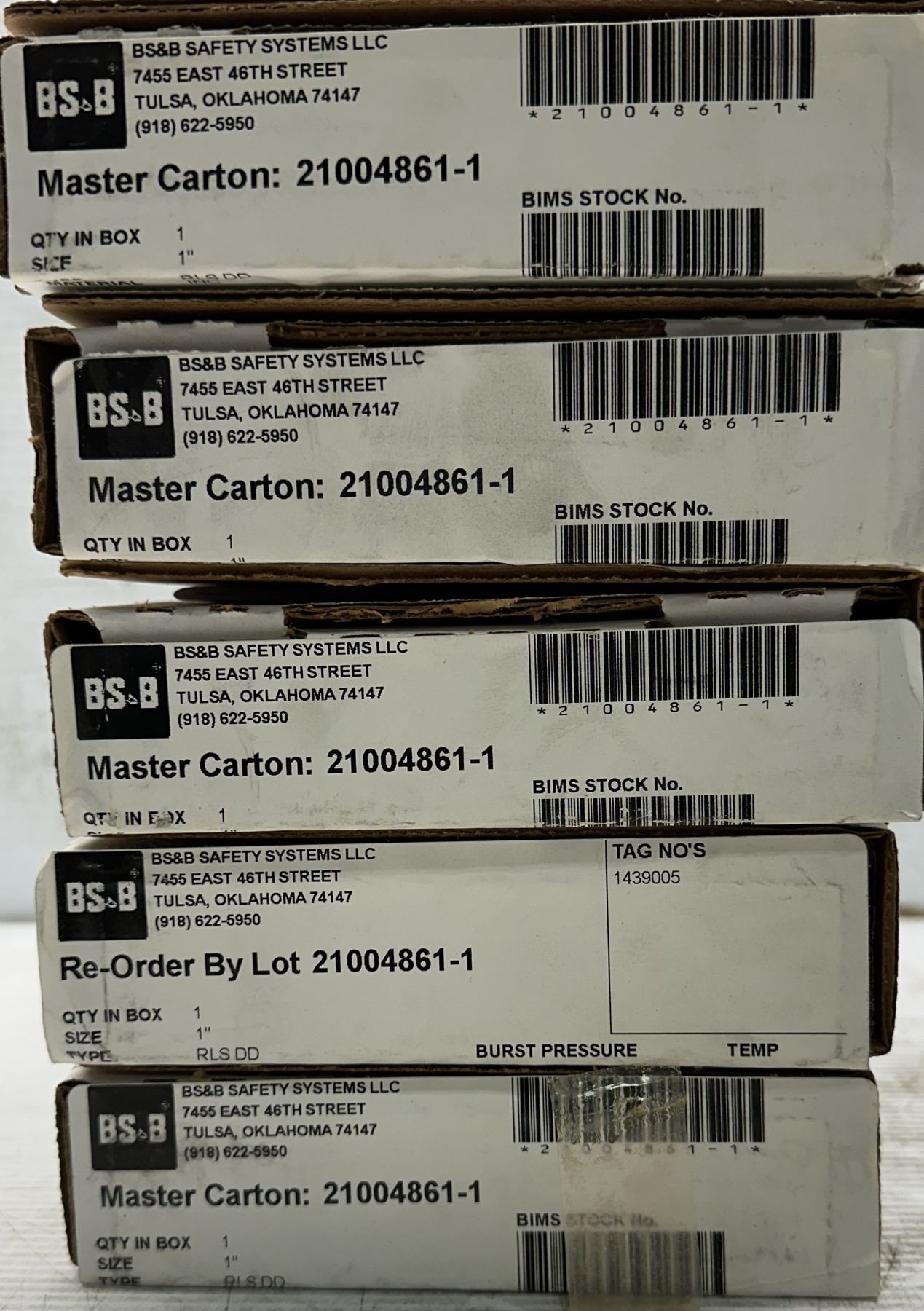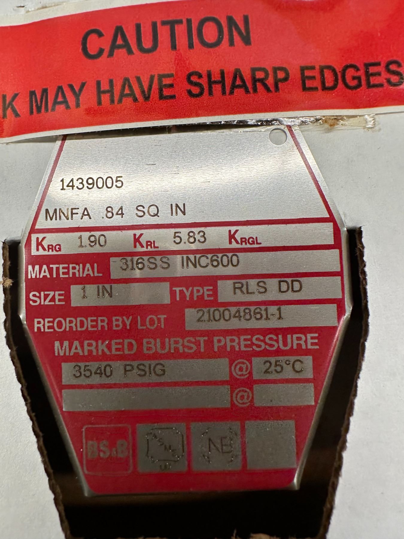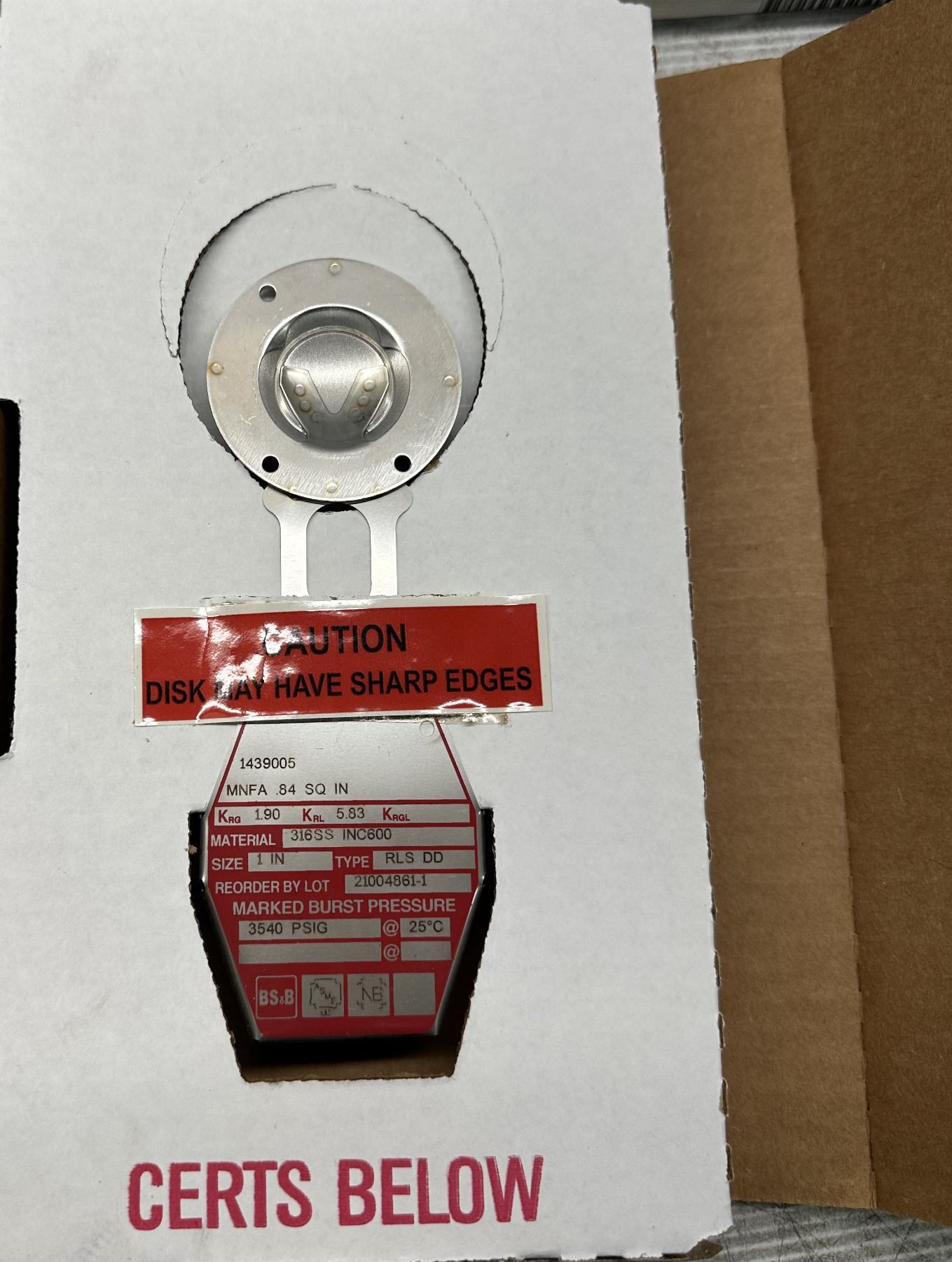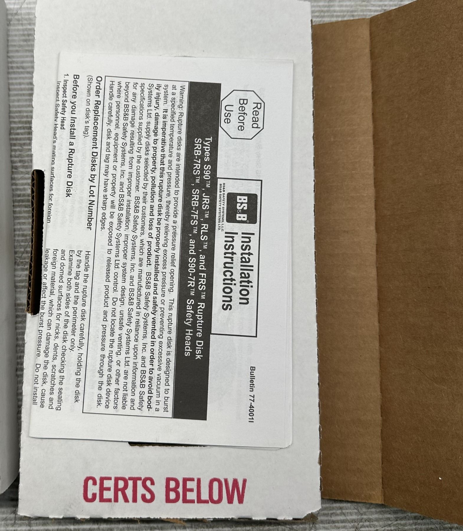 Lot 817 (5) BS&B Safety #21004861-1 Rupture Disc Burst Pressure 3540PSI(G) @ 25 Degrees C