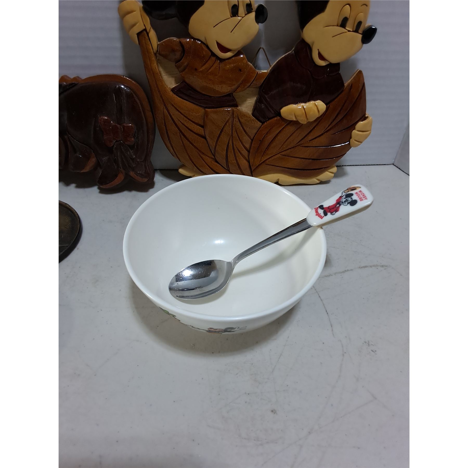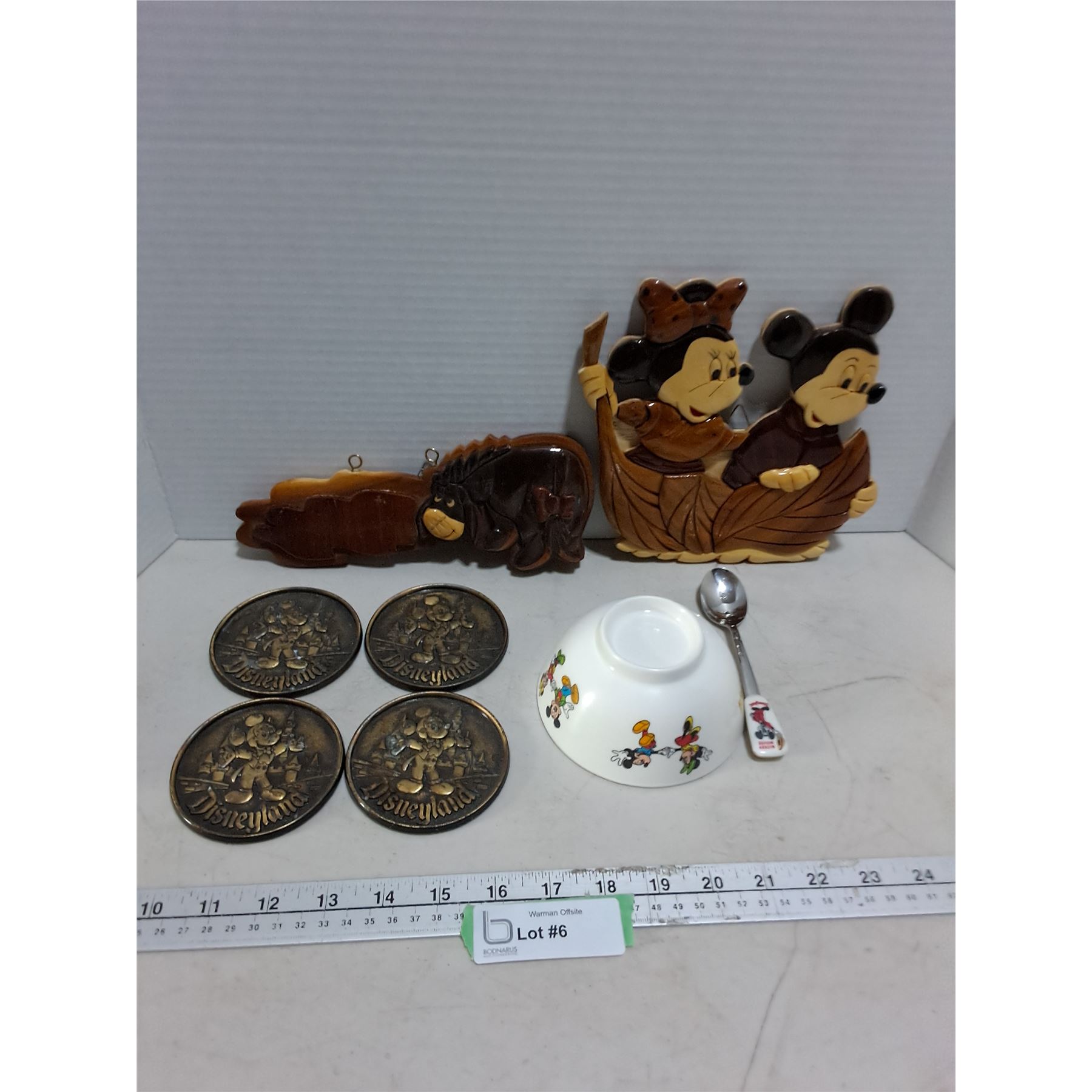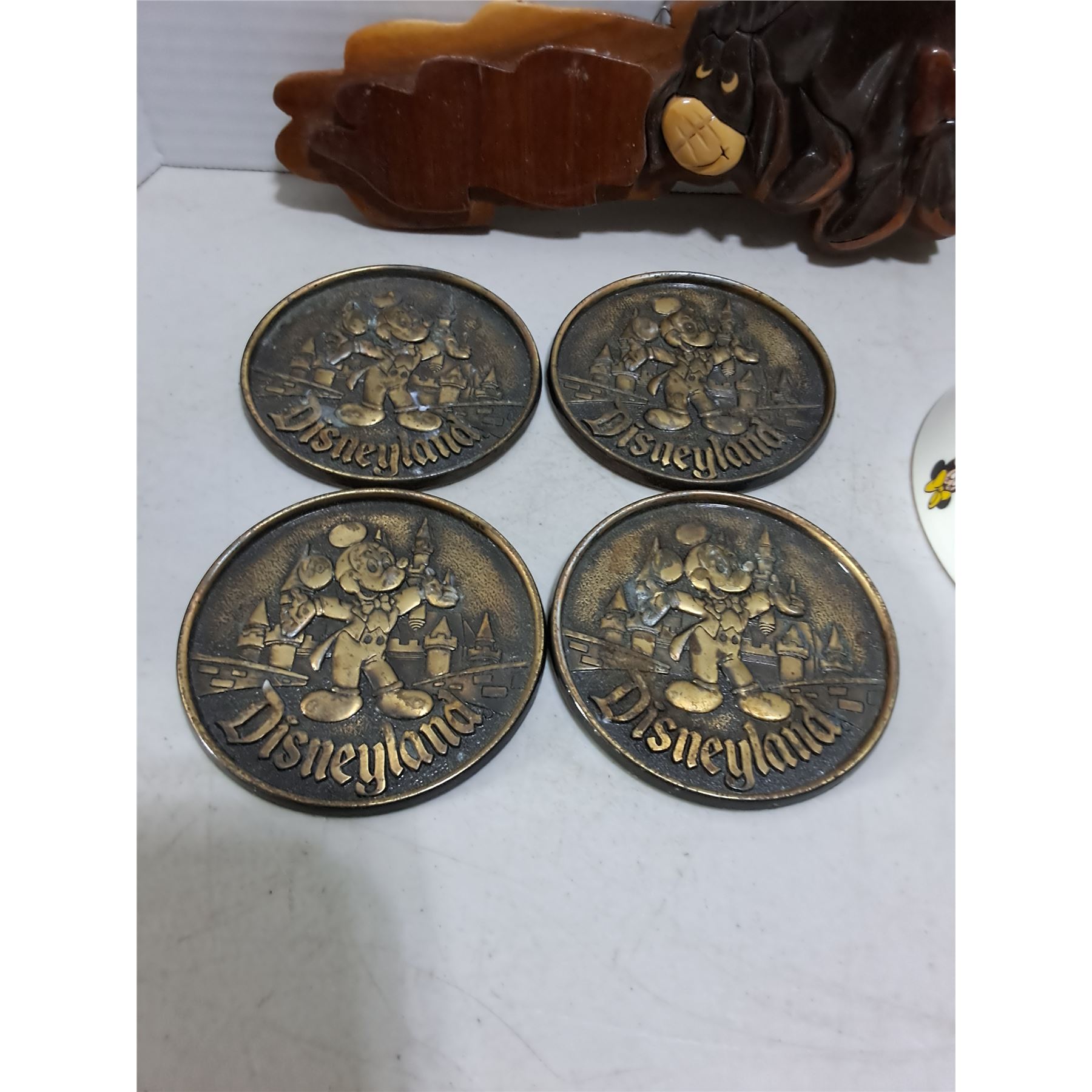 Lot 6 Disney/Winnie-the-Pooh Memorabilia (Brass Coasters, Wood Wall Decor, Bowl/Spoon Combo)