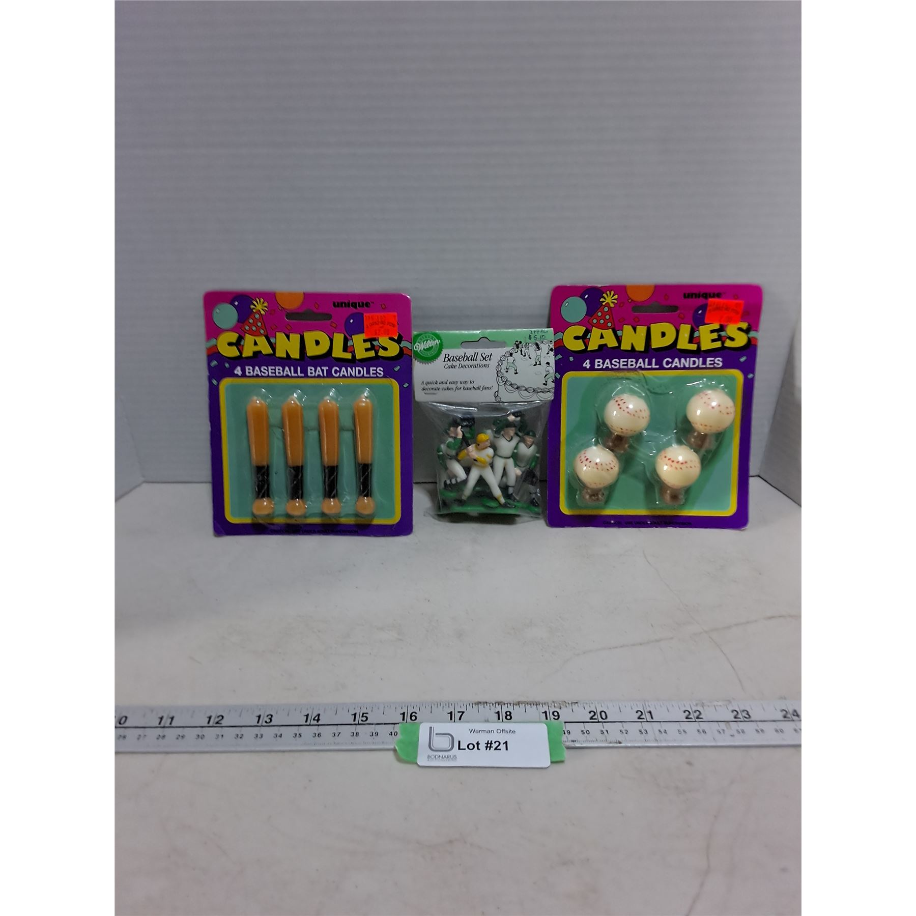 Lot 21 (3) Sealed Baseball Themed Cake Candles & Decorations